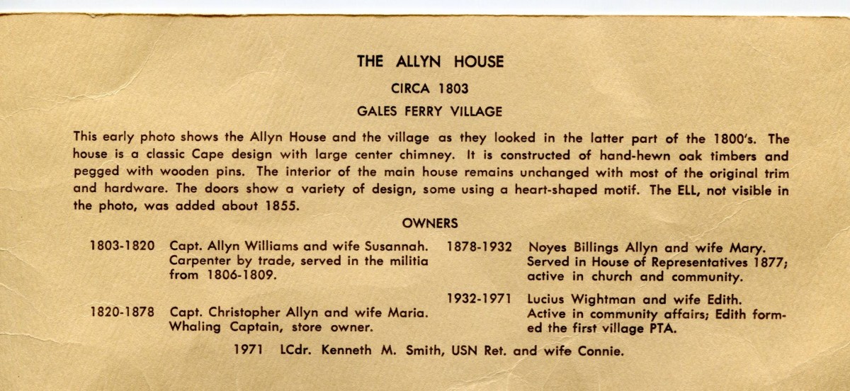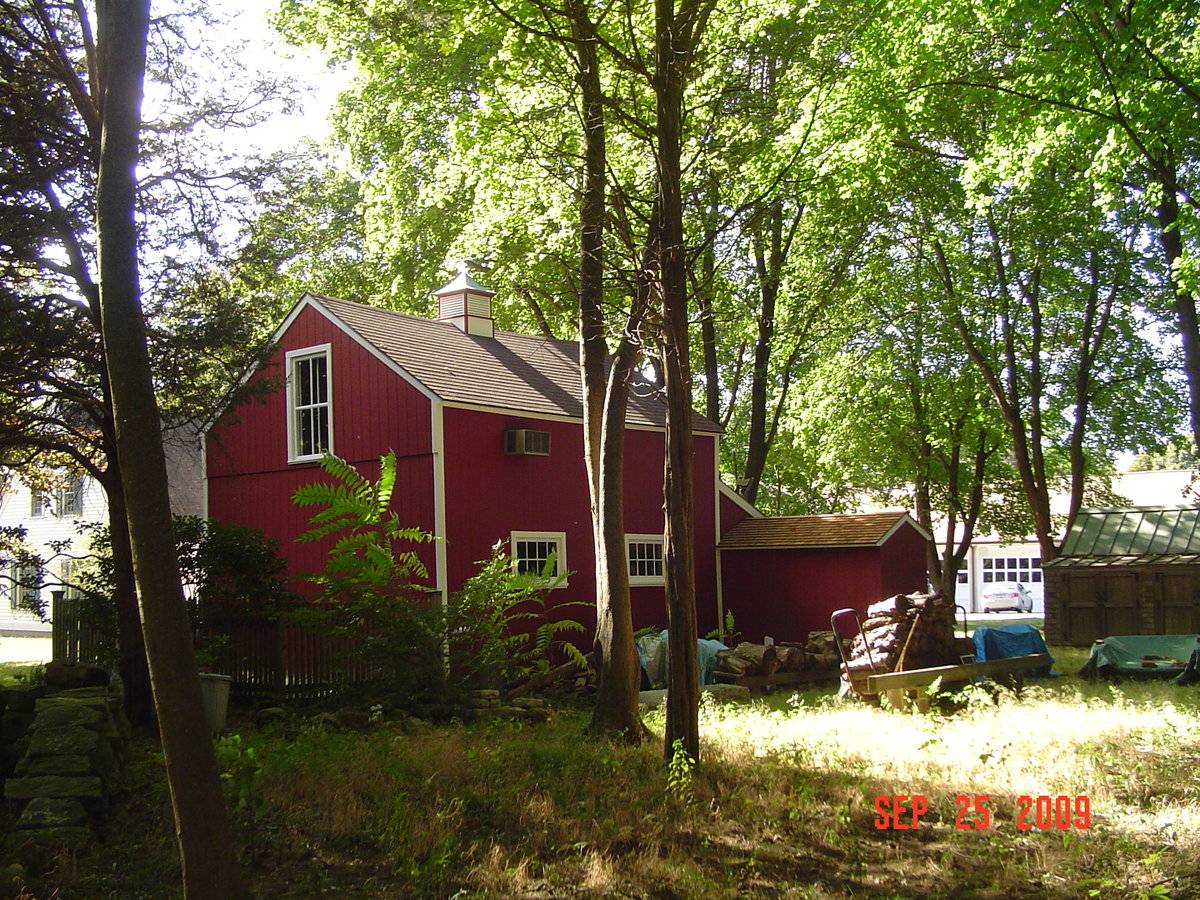 Barn original to site but moved to present location. Wooden vertical board siding is replacement siding. Present reuse for storage. Gales Ferry Historic District No. 2. I lived in the Capt. Allyn Williams house from 1971 until about 1978. I was co-authur of Historic Ledyard Vol. l Gales Ferry village. The barn you show is not as it was for many years earlier than 1978. I have several pictures to show the original. The sepia was a very early photo of the estate. The barns were moved behind the house, when I do not know. The color photo is my husband and I planting a Copper beech in celebration of our daughter Amy's birth in 1972. - Carolyn E. Smith, 9/28/2013