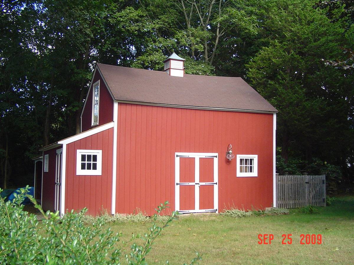 The roof is asphalt shingles and there is a small cupola with a hip roof, covered in copper roofing, with louvered panels in all sides. Siding is vertical flush boards painted red with white corner boards and window trim.