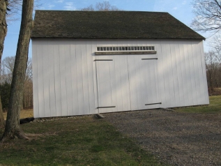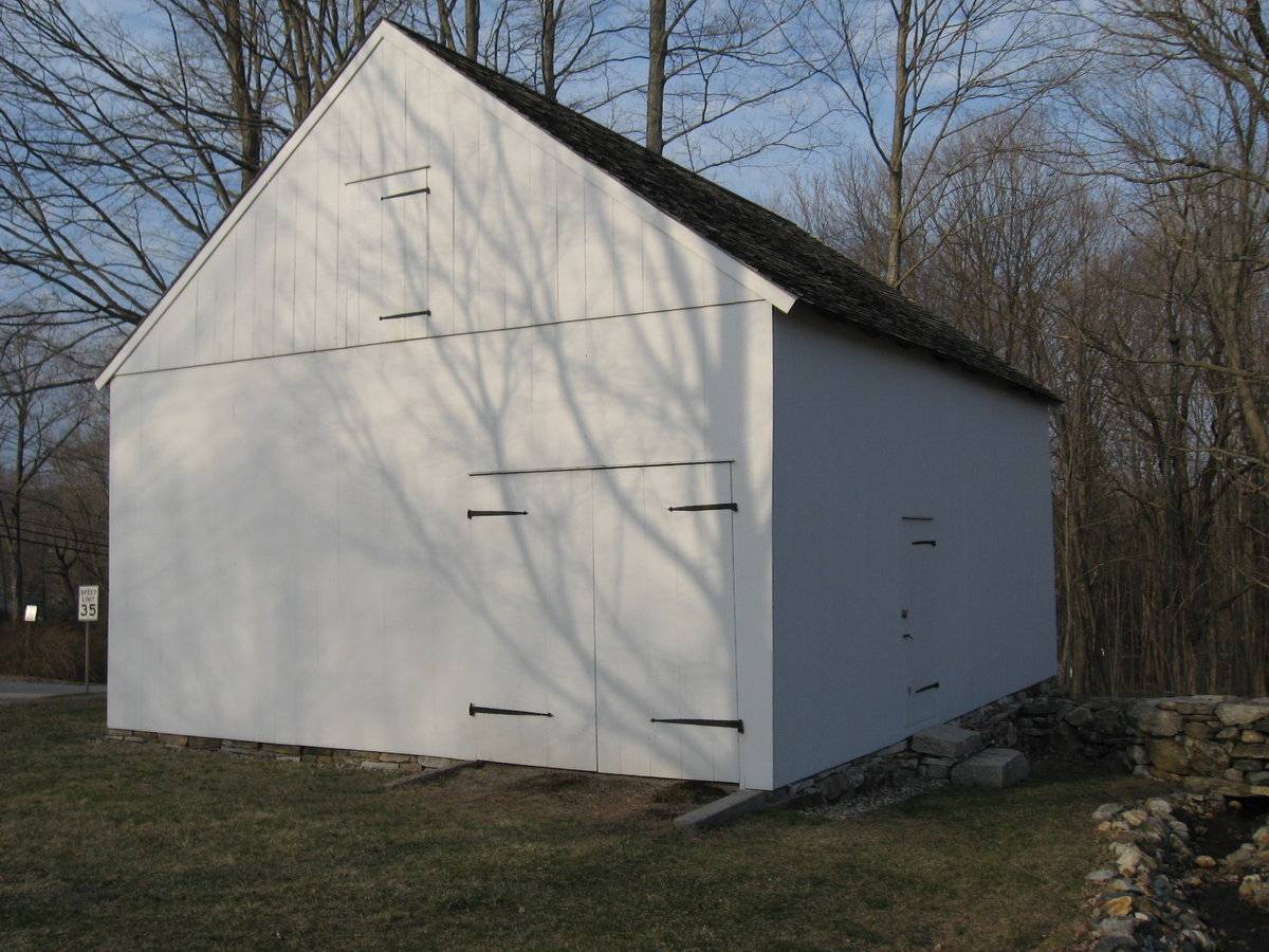 This is a 1 1/2-story three-bay gable-roofed eave-entry barn. The main façade faces northwest and the ridge-line of the barn is approximately parallel with this portion of Hebron Road, which runs southwest-northeast. The main entry is a pair of exterior-swinging doors with iron strap hinges in the middle bay. Above the main entry there is an unpainted wooden lintel and a nineteen-pane transom window. The remainder of the façade is blank. The southwest gable-end has a pair of exterior-swinging doors in the right (south) corner and a single exterior-swinging hay door in the gable attic, above the girt line siding divide. All have iron strap hinges. The ground slopes down gently towards the east, revealing a fieldstone foundation in the southeast eave-side of the barn. This side is blank except for a single exterior-swinging pass-through door to the left (south) of center, which is approached by stone steps. The northeast gable-end appears to be blank, with a fieldstone foundation. The barn has vertical flush-board siding painted white. The roof is covered with wood shingles.