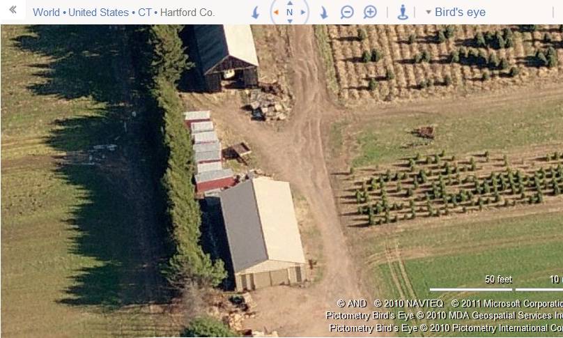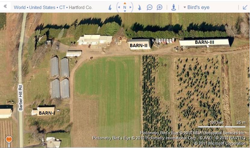 The semi-subterranean barn, Barn-I is located along the western edge of the property abutting to Barber Hill Road. Barn-II and the tobacco shed, Barn-III are located along the northern edge of the property with their gable-ends facing each other; Barn-II towards the west and Barn-III towards the east. The ridge lines of all the three barns, Barn-I, Barn-II and Barn-III run east-west parallel to each other but perpendicular to the road. The circa 1800 colonial main residence of the property is located towards the south of Barn-I. At least four green houses can be seen towards the immediate northeast of Barn-I while few sheds and outbuildings can be seen scattered in the northwest corner of the property. The rest of the property towards the south and the east of the barn complex has farm land practicing active agriculture.