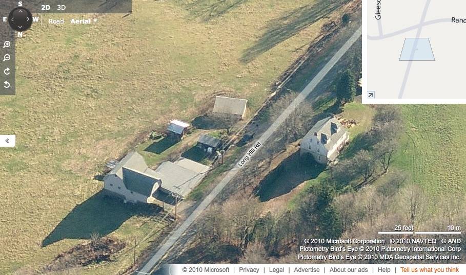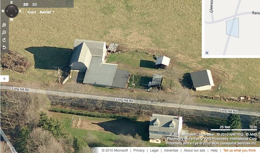 The main barn and its additions is located towards the north of the barn complex while two gable-roof sheds can be seen towards the south with their ridge lines running east-west perpendicular to Long Hill Road. Another salt-box roof out-building can be seen towards further south with its ridge line at an angle from the northeast to the southwest. The building complex is surrounded by farm land towards the north, east and the south.