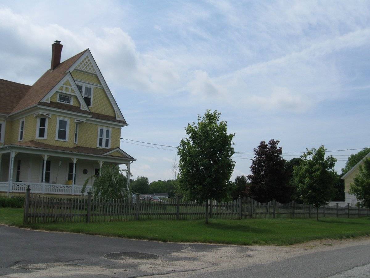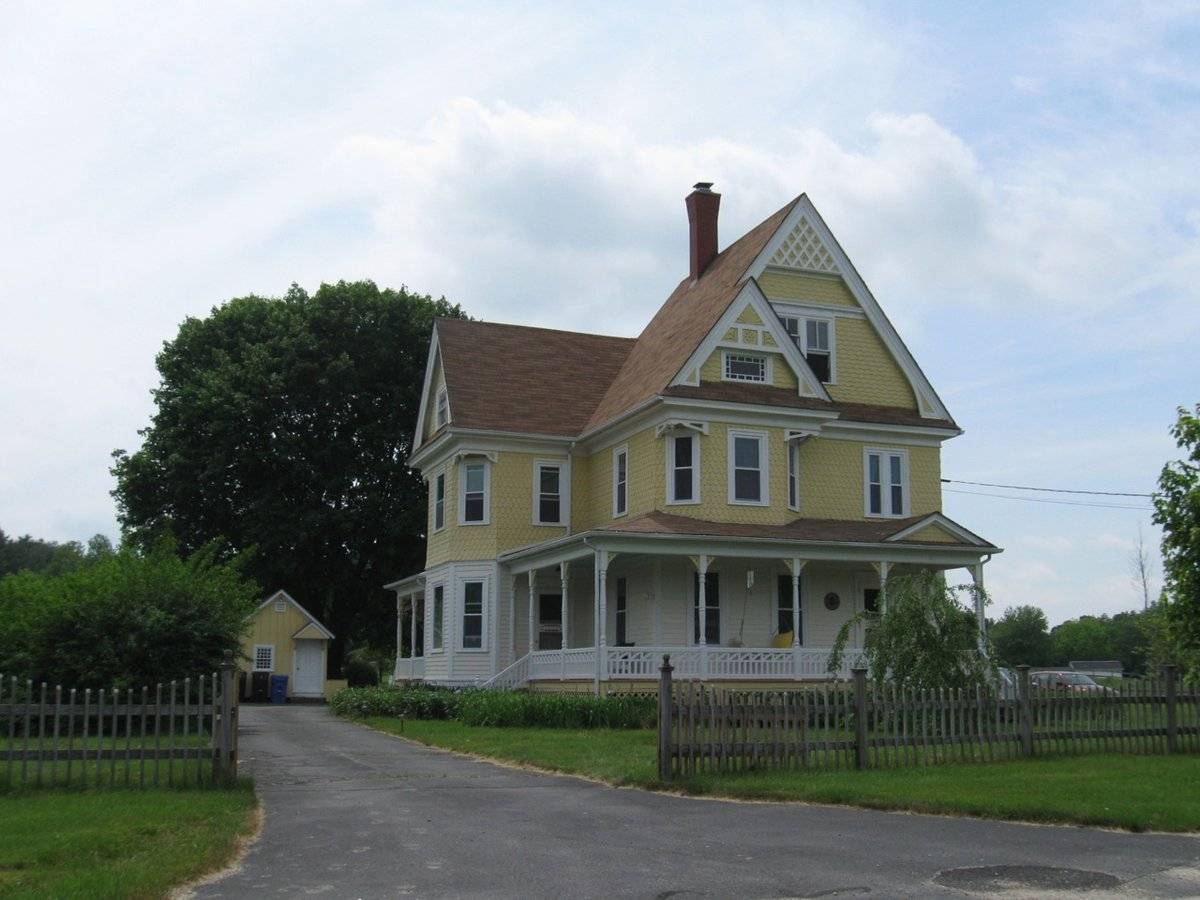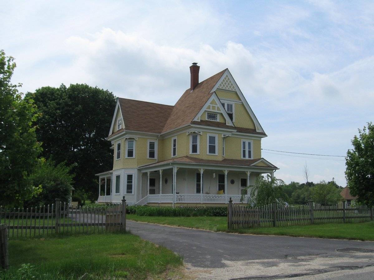 Victorian house, barn to the north, huge stone walls built from local granite quarry leftovers. This used to be a big farm, subdivided and several houses newly built to the south along Newport Rd. Info from owner of 102 Newport Rd. across the street.
