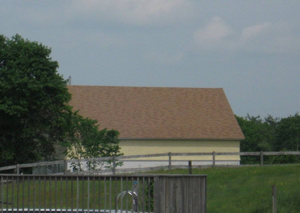 The east eave-side has five windows which appear to have been six-over-six double-hung with trim, but have been converted to six-pane stable windows in the lower area with solid panels of fish-scale shingles above. There are three basement windows set into the top course of granite block masonry.