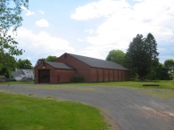 This is a 1 ½ - story nine-bay gable-entry barn with a gable-roof addition on its east gable-side. The east gable-sides of the main barn and the gable-roof addition face Main Street while their ridge lines runs east-west, perpendicular to the road. The main façade of the barn is the east gable-side of the gable-roof addition with the main entrance at the center through an over-head garage door. The façade has a louvered vent just below the apex of the roof. The north eave-side of the gable-roof addition has an entrance through a pass-through door towards the east. The east gable-side of the main barn has a distinct dropped girt siding divide line and has a louvered vent just below the apex of the roof. The nine-bays on the north eave-side of the main barn have been distinctly demarcated by protruding brick piers.