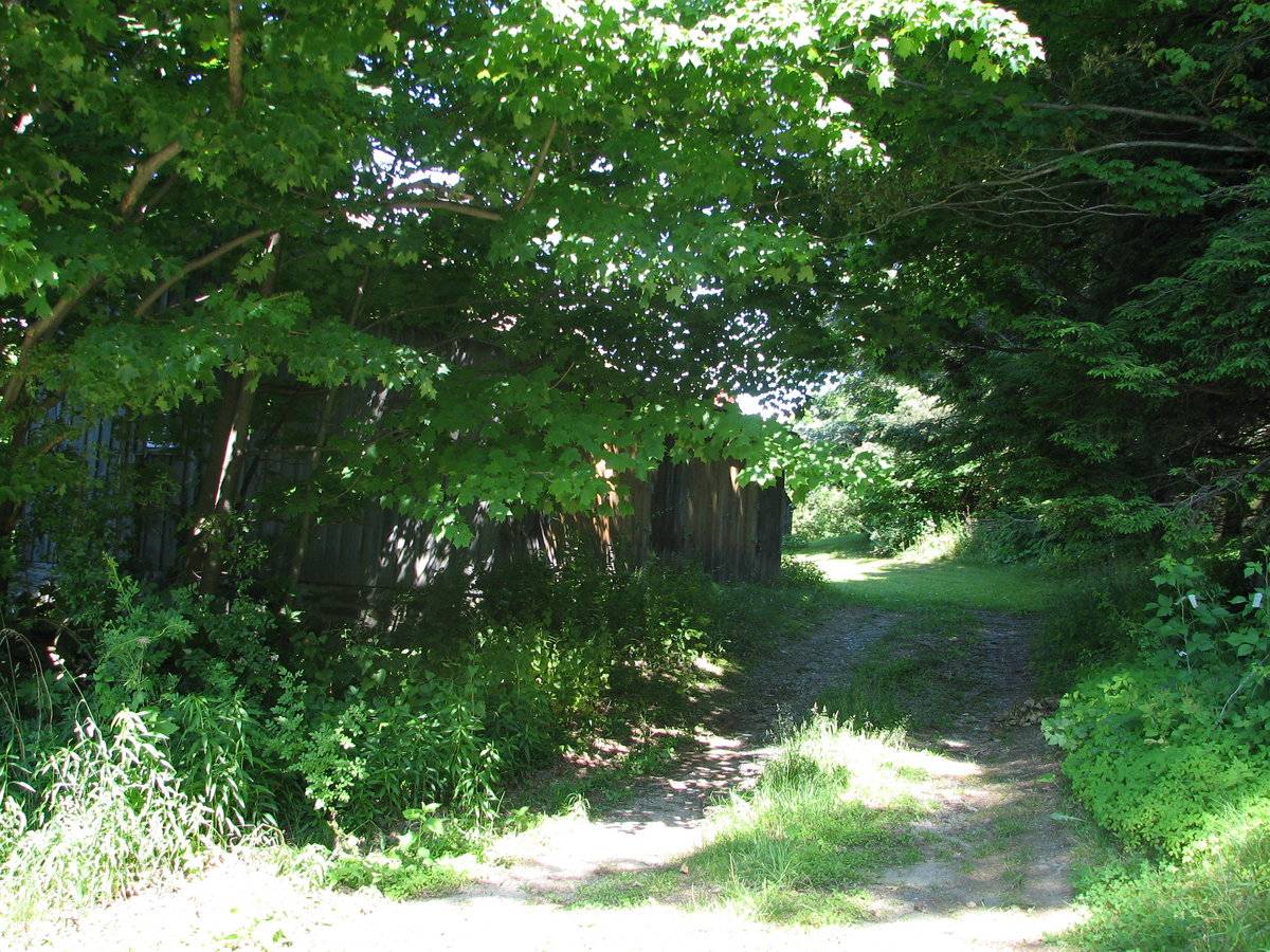 The barn stands on the east side of Tophet Road, to the north of the small board-and-batten barn. The c. 1770 house on this property stands to the south. Features include: 26 x 50, 26 x 60; peak-roofed barn consists of two elongated blocks arranged in an L-plan. The west block is oriented with one gable to the west and intersecting at its east end with the north end of the east block; western part of the west block is probably an old English barn (now clad in drop siding), which has been elongated to the east (that part is clad in board and batten); a pair of rolling doors is centered on the south elevation of this block, which has a standing seam roof; shed addition to north; concrete block base; interior is framed with hewn timbers; dirt floor. The east block of the L-shaped barn has an asphalt shingle roof and is clad in board and batten; west side frames the barnyard; on the east side a two-part shed-roof addition runs from the south gable end to a shingled silo at the northeast corner of the barn.
