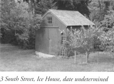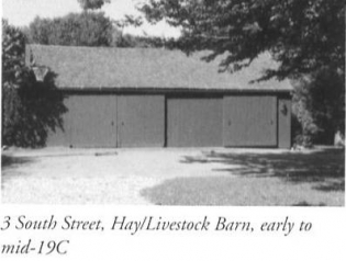The hewn frame and lack of ridgepole suggests an early date for this barn, which was possibly during the Bacon ownership in the first half of the 19th century. Archival photographs of the property show tobacco fields to the west, suggesting this outbuilding was a tobacco barn. In more recent years the south end was used for repairing cars. The north end has been remodeled as a pool house. The large barn located behind the Old Town Hall at 7 South Street, next door, was originally attached to the south end of this structure.