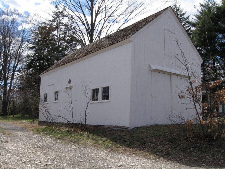 This is a 1-½ story gable-entry barn. The main façade faces north and the ridgeline runs north-south, perpendicular to School Street which lies to the north. Principal entry is provided by a pair of hinged doors constructed of vertical wood boards. Above the door is a flared hood, and a hinged hay door that is also constructed of vertical boards with wrought iron hardware. On the west eave-side are three two-pane stable windows with trim. On the south gable-end is a pair of hinged hay doors with a flared hood and a hay loft door, both identical to those found on the main façade. On the east eave-side there are four two-pane stable windows with trim, a pass-through door, and what appears to be a hinged hay-loft door on the southeast corner. The exterior walls are covered with painted vertical board siding. The roof is covered with what appears to be wood shingles. The foundation appears to be constructed of un-mortared fieldstone.