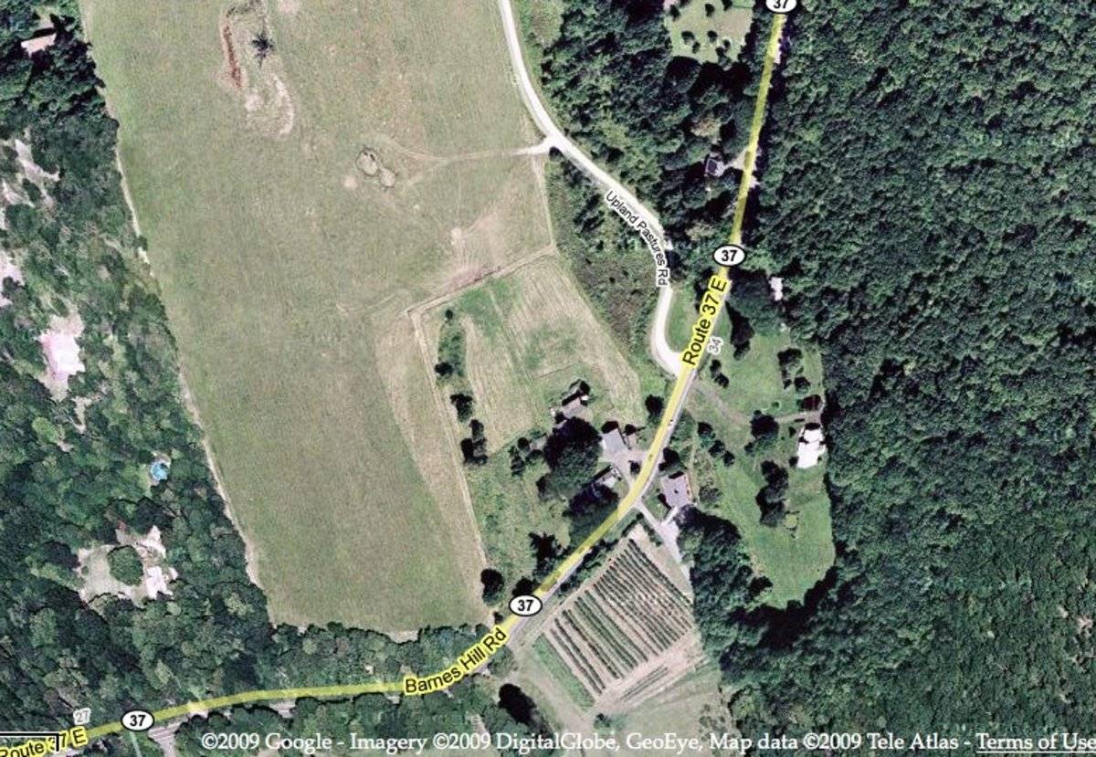 The barn is to the north of the house with which it is associated. The main façade of the house faces approximately north and the ridge-line is approximately parallel with Route 37 East. Also on this property is an open tract of land and a vineyard. A long driveway extends to the south off Route 37 East, leading to the house. A section of the driveway splits off towards the east and leads to the barn. To the south of the house is a pool, and to the west are two small ponds. The property is to the south of the intersection of Upland Pastures Road and Route 37 East. To the north and south of the property are open tracts of land, woodland, and a few residential areas. To the east are woodland and some residential areas. To the west are open tracts of land, woodland and some residential areas. Surrounding the property are residential areas, woodland and open tracts of land.