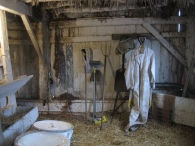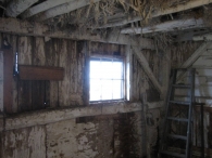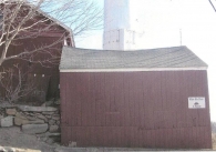 The grade drops dramatically towards the west across the south gable-end of the barn, revealing a full basement level. A stone retaining wall extends to the south off the east corner of the south gable-end of the barn. Near the south corner is an exterior hung sliding pass-through door with a shed-roof hood protruding just above it. Found in the gable-attic of the south gable-end is a two-pane window. The grade inclines towards the west, along the west eave-side of the barn. (However, an older picture reveals that this was not always the case. The entries on this side were once reached by a wooden staircase. The ground was filled in so the entry was at grade.) Attached to the west eave-side of the barn and extending to the west is a shed-roof addition. This addition encompasses the entire bottom 2/3 of the west eave-side of the barn. A six-pane window is found just below the eave, north of center on the west eave-side of the barn. There are no other openings on this side. There appears to be a window in the gable-attic of the north gable-end of the barn. There appear to be no other openings on this side.