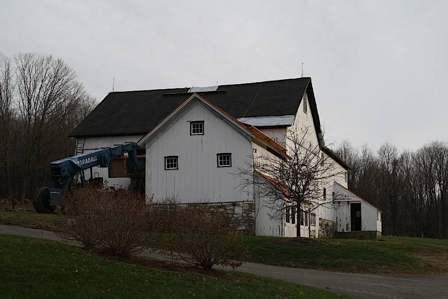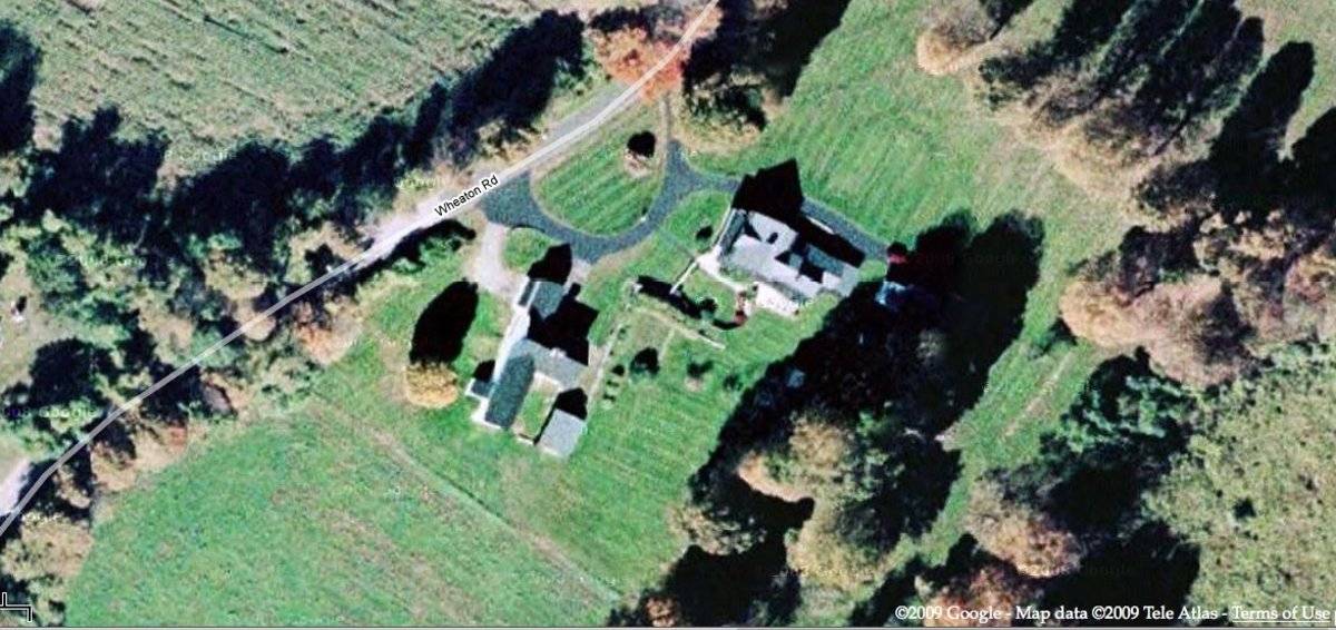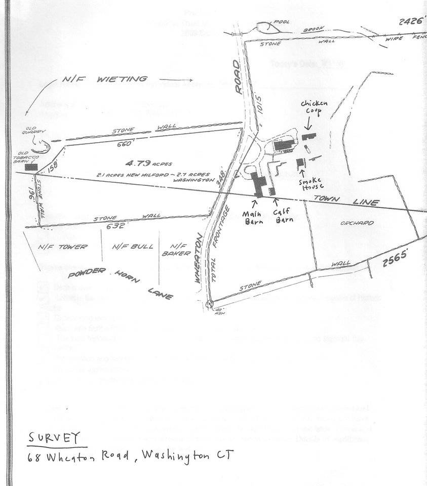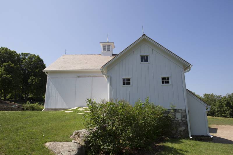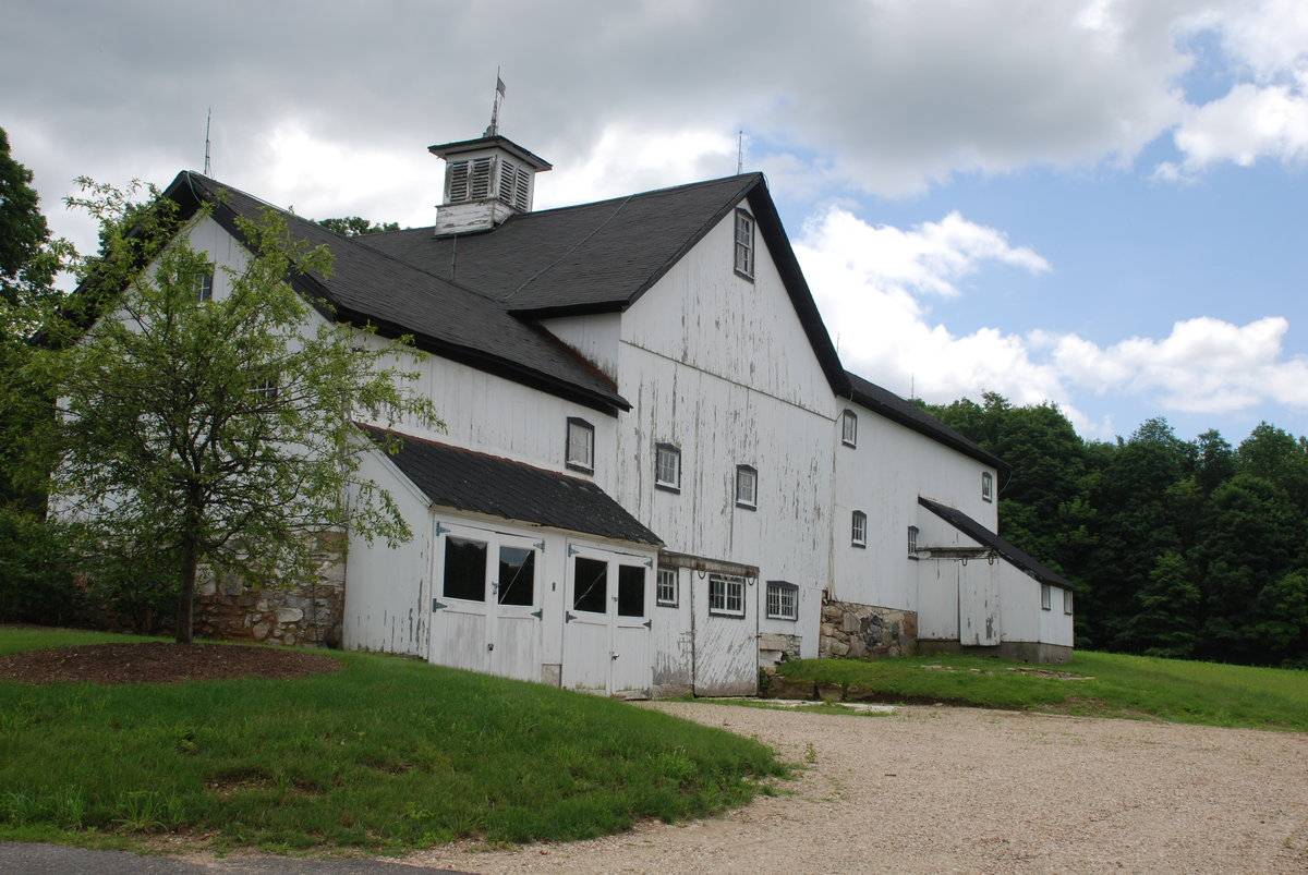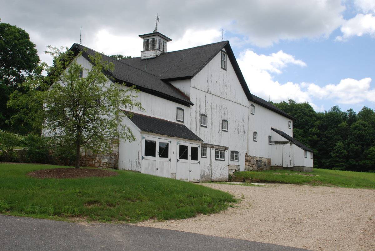 The barn is in front of to the southwest of the c.1845 house it is associated with. The ridge-line of the house is parallel to the ridge-line of the main section of the barn. Just to the northwest of the house is a bend in Wheaton Road: north of the bend the road runs north-south; south of the bent the road runs northeast-southwest. Just south of the bent is a circular driveway that accesses both the house and the barn. Stone or marble walls demarcate the 70 acre site to the south, west (fronting Wheaton Road) and north. Stone or marble walls run through the site. Just south of the barn is a gable-roofed calf barn. To the south of he house is a chicken coop and a gable-roofed smokehouse. To the east of the house are two gardens. To the south and east of the barn are tracts of open space. Further south and east is woodland. Across Wheaton Road to the west are large tracts of open space. The area surrounding the site is residential, active agriculture, open space and woodland.