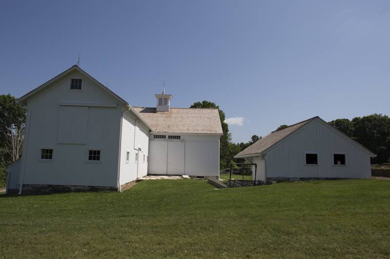 The south addition extends south from the west bay in the south eave-facade of the main structure. The north gable-side of the addition is entirely encompassed by the west bay of the main structure. The east eave-side of the addition has a centered sliding pass-through door with trim flanked by two six-pane windows with trim. Just to the south of the sliding door, beneath the eave, is an exterior sliding hay door with its track extending to the south. The south gable-end of the south addition has a slightly off-centered twelve-pane window on the main level and a centered exterior sliding hay door above. The top of the hay door is parallel with the eave. The hooded track of the hay door extends to the east. Centered in the gable attic is a six-pane window with trim. The grade declines slightly, revealing more of the mortared marble foundation. The west eave-side of the south addition is flush with the west gable-side of the main barn. Off-centered to the south is a shed-roofed addition, extending to the west. Six-pane windows with trim adorn the shed-roofed addition as well as the main level of the south addition. A single six-pane window is just beneath the eave at the intersection of the main barn and the addition.