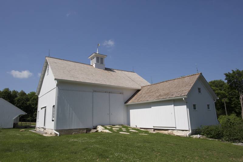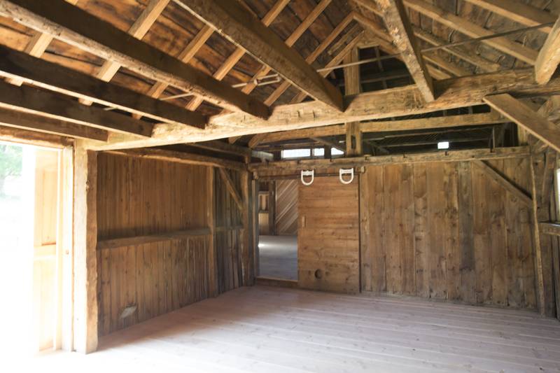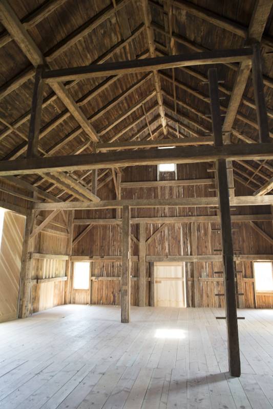 The oldest barns still found in the state are called the “English Barn,” “side-entry barn,” “eave entry,” or a 30 x 40. They are simple buildings with rectangular plan, pitched gable roof, and a door or doors located on one or both of the eave sides of the building based on the grain warehouses of the English colonists’ homeland. The name “30 by 40” originates from its size (in feet), which was large enough for 1 family and could service about 100 acres. The multi-purpose use of the English barn is reflected by the building’s construction in three distinct bays - one for each use. The middle bay was used for threshing, which is separating the seed from the stalk in wheat and oat by beating the stalks with a flail. The flanking bays would be for animals and hay storage.