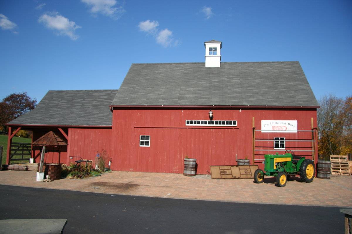 Vertical siding, asphalt shingle gable roof, new England barn. Part of retail business.