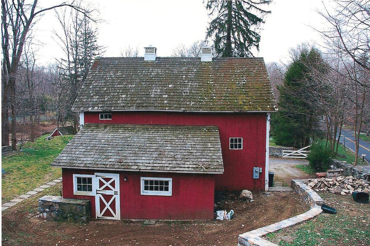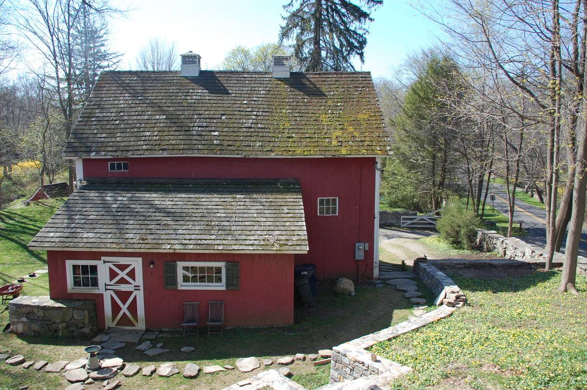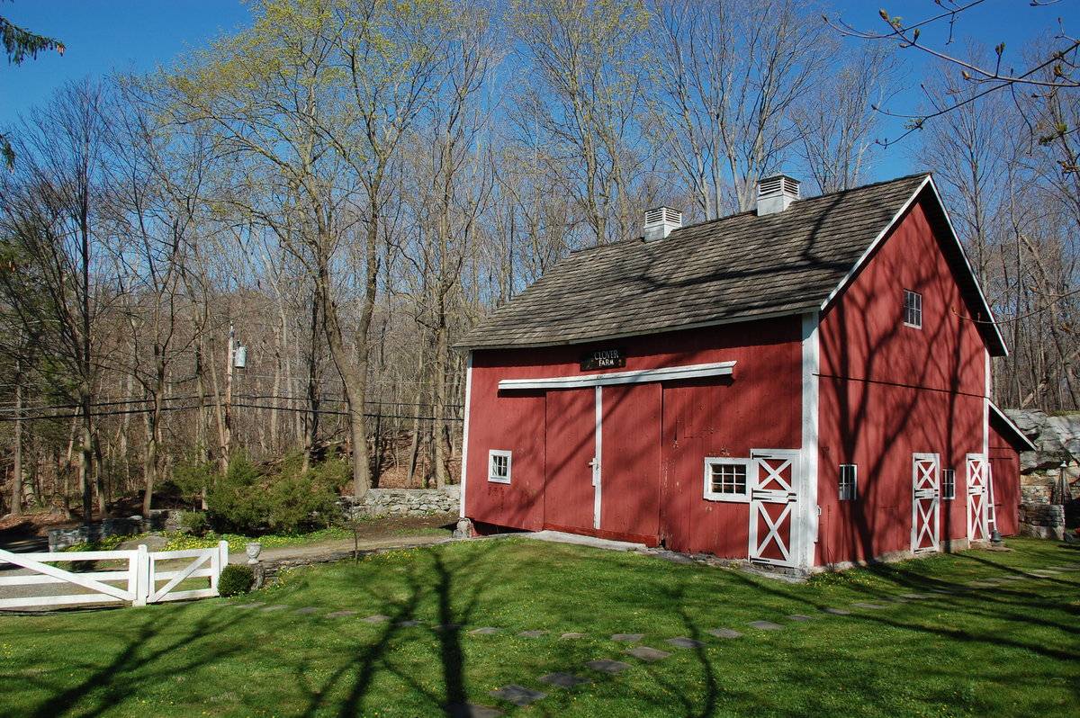 The barn faces south to John Street and is perpendicular to Bedford Road. It is set back on the property behind the associated house. A second barn and garden is located on the property is north of the barn with stone walls located west of the barn.