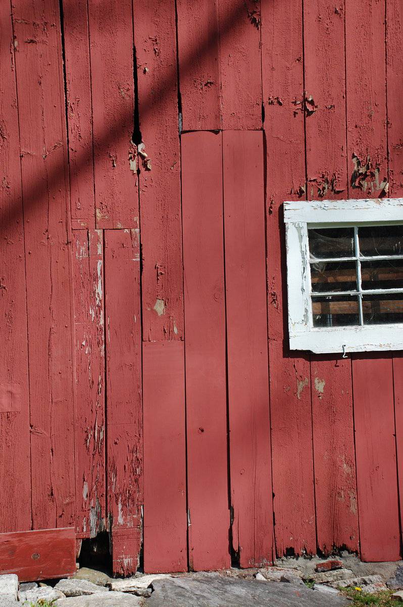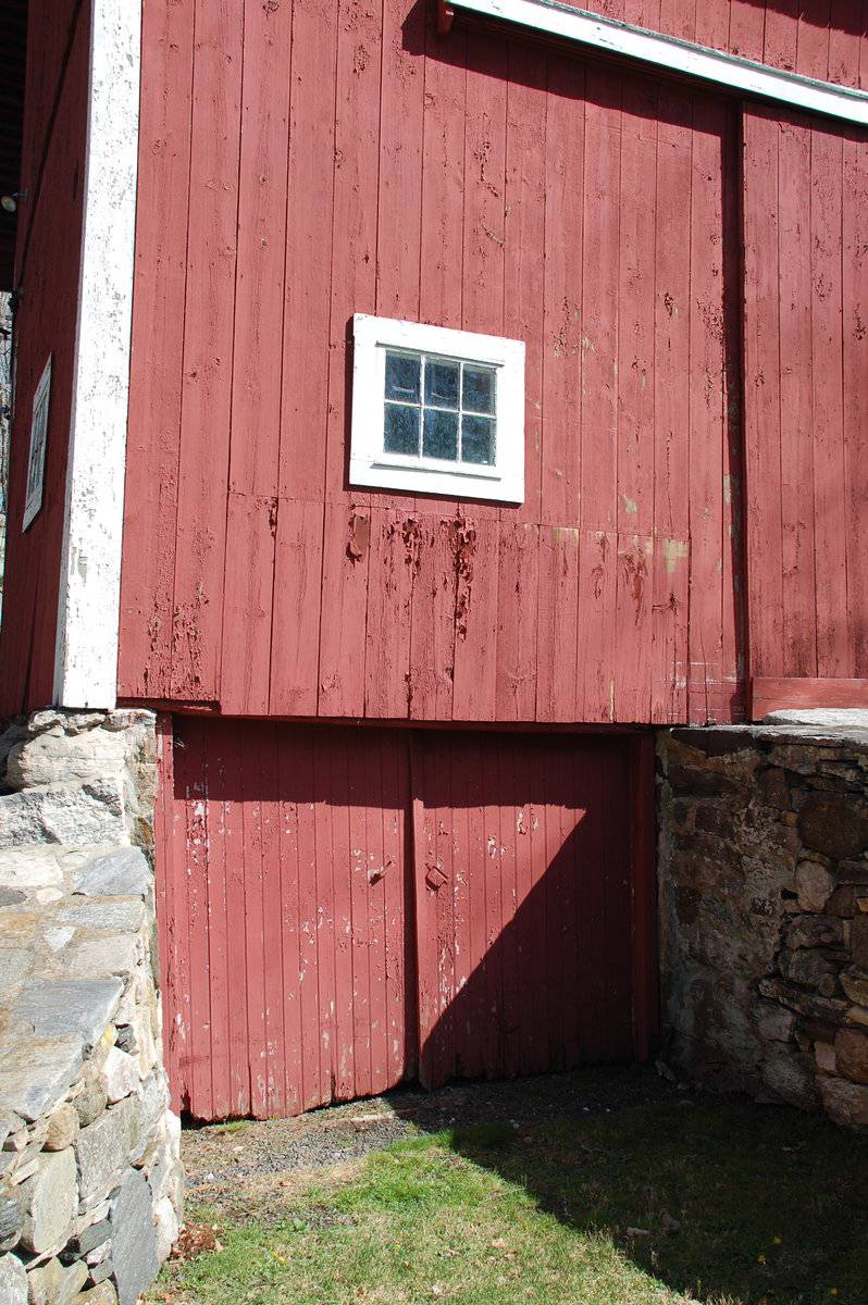 The gable-roofed addition is off of the center and east bay of the main structure. A pass-through door is on the north facade with a fixed six-pane window to the east and a fixed five-over-five window to the west. The west gable-facade appears to have a fixed six-pane window on the south half of the facade and a fixed three paned window above the shed-roofed addition. The barn has vertical siding that is painted red with white trim and an un-mortared fieldstone foundation. The roof has wood shingles with two evenly spaced louvered ventilators.
