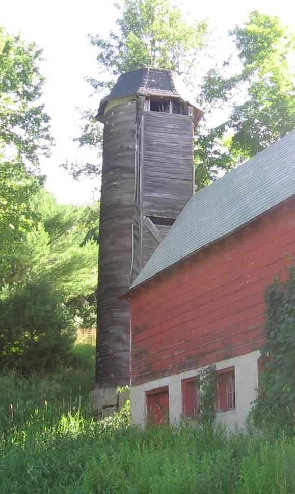 The silo stands at the southeast corner of the Catty cow barn. This lawn to the west and woodland to the south and southeast. The Rte. 8 entrance ramp is located immediately to the south.