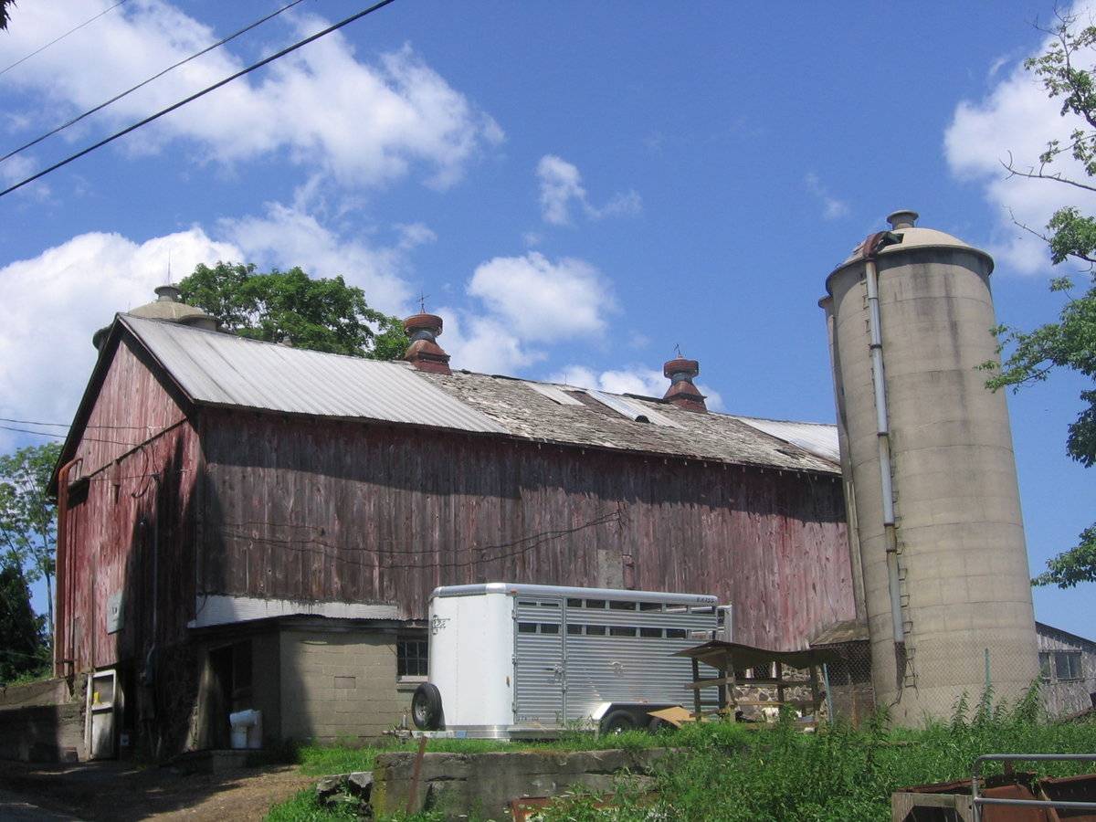 See Milton/Bantam Survey, IF # 116. (n.b.: date of this barn in 1941, not 19C. Silos are concrete block, not poured concrete). The red-painted Kar-Mic Dairy barn stands on a massive fieldstone foundation with its gable ends oriented to the east and west. The structure is banked to the south and east to accommodate the sloping site, and the stone foundation rises a full story at the south. The two-story design offers primary access at the upper level on the north façade, adjacent to the north silo, and on the lower level through a door on the west gable end next to the one-story concrete-block dairy room projecting form the southwest corner. The upper level serves as the hay barn and loft, now used to store bailed hay. The metal cupolas are designed to ventilate hot air during the curing process. The lower level is the cow barn. The lower cow barn, finished with a concrete floor, is fitted with galvanized steel pipe “mushroom” stall dividers and stanchions. The wide center aisle was designed so a tractor could drive between the manure troughs. Additions to the east were made to accommodate more cows in the 1980s. Box stalls, mainly for calves, were located in the northeast section.