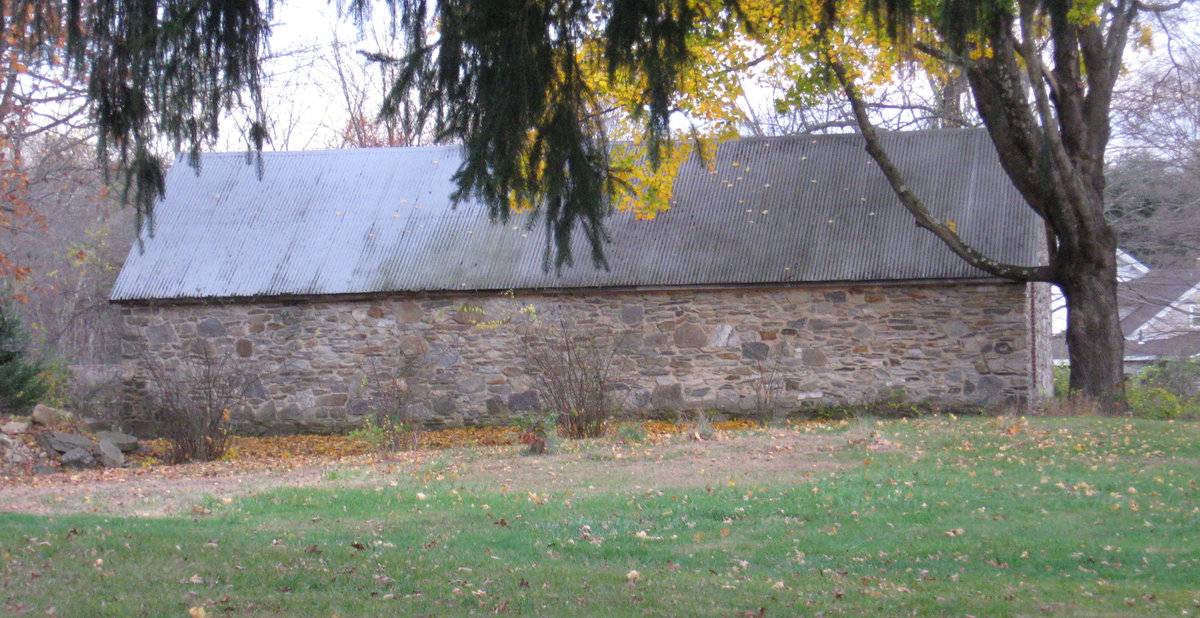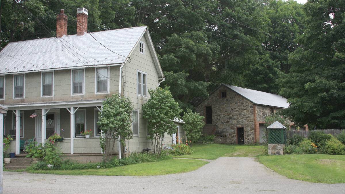 Behind a store fronting Main St., is a house, behind the house a stone and brick barn. Located in the South Coventry Historic District.