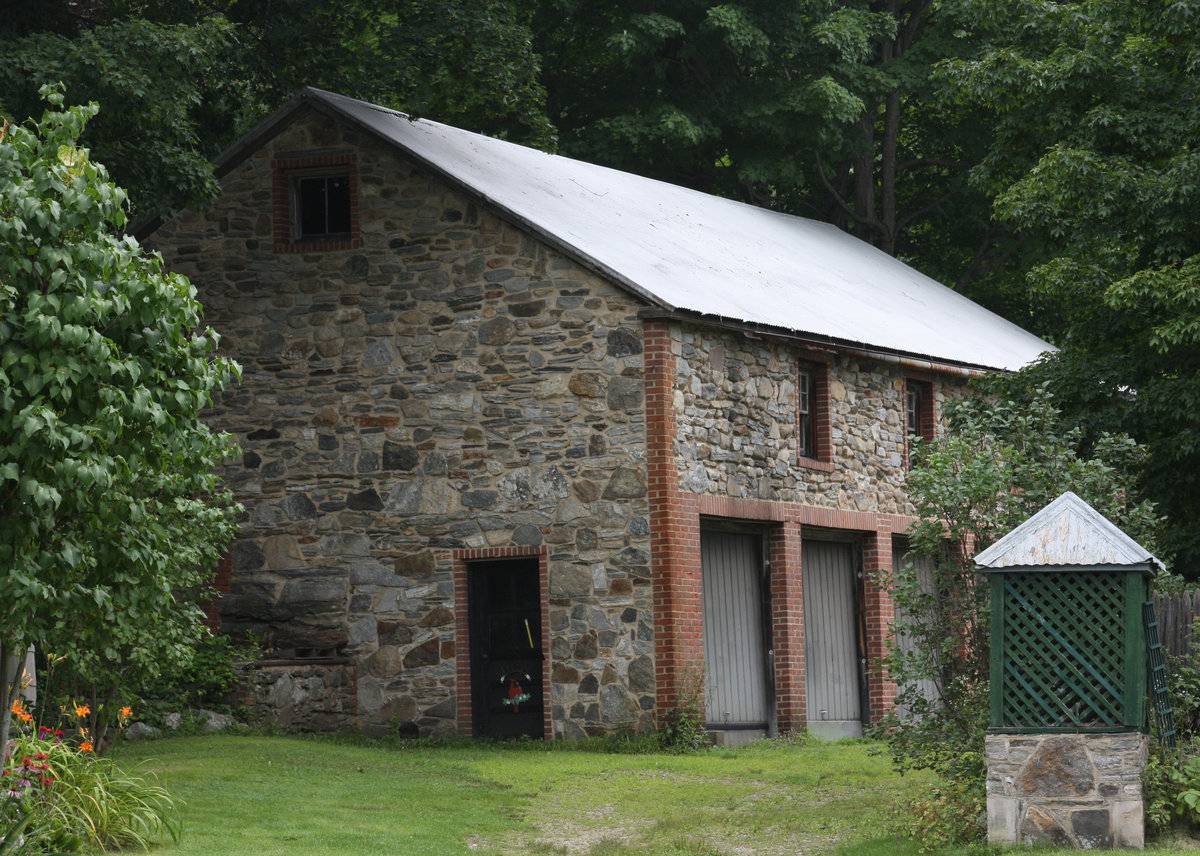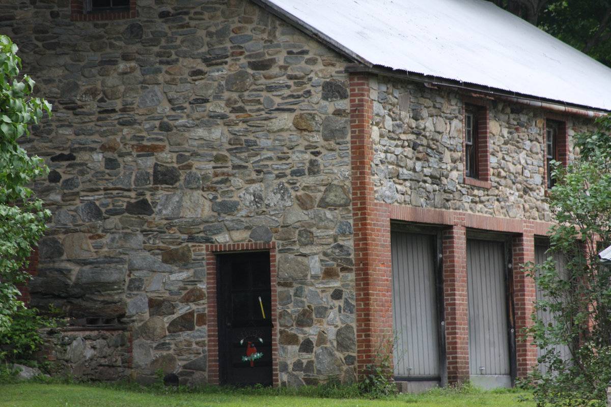 This is a 1 1/2-story field-stone carriage house with brick details. The east face is the main entrance and has five garage door openings. Each door is painted gray and has vertical wood siding. Framing each entrance is brick; the posts have horizontal laid brick and the lintel has vertical soldier course brick. There are also three six-over-six double hung windows above the central door openings, each framed in brick. The corners of the front facade of the structure have brick quoins. There is a pass-through door on the south gable facade close to the southeast corner, framed in brick. There is a window framed in brick just under the apex. Also on the south gable-end is a set of stone stairs on brick supports that lead to an entrance to the second level of the structure, also framed in brick. There are no openings or details on the west eave side of the structure, which is built into the slope of the hill. There appear to be no openings on the north gable-end which is also built into the slope which rises toward the north and west. The carriage house has a tin roof.