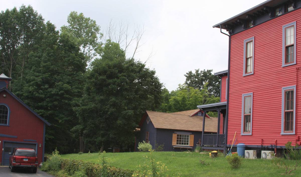 The associated house is a 2 ½-story 19th-century Italianate to Queen Anne-style building with its ridge-line oriented north-south perpendicular to the street. An unusual feature is a chimney in the north gable-end facing the street, in the center of three bays. The attic gable is an ornamented pediment topped by the chimney as it emerges from the roof ridge. The main entry is in the angle between the main block and an east-side projecting gabled wing with a turret. A 1-story porch covers the entry area. This house is set near the east property line. The carriage barn is near the west property line, closer to the adjacent house. The 2-acre property extends southward to the bank of Mill Brook and slopes down toward the south. A driveway from the street extends south to the north facade of the carriage barn.