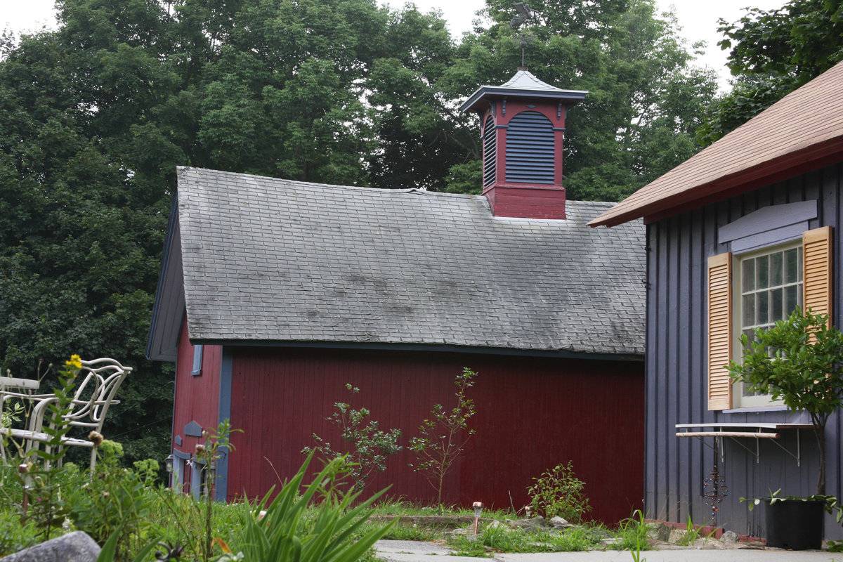 This is a 1 1/2-story gable-roofed carriage house, its ridge-line oriented north-south perpendicular to the street, with vertical siding. The north gable-end has two garage door openings at grade. The remains of lintel trim from earlier openings on the wall above suggest that originally a central barn door was flanked by windows. The east bay has been covered in vertical siding and has a pass-through door at the center; the west bay has a modern overhead garage door. Above the first floor and under the apex is a large, sixteen-pane round-arched window. The barn is painted deep red and has blue detailing, particularly framing the window, the roof, the garage doors and the quoins. The west eave side has a six-over-six double hung window as well as three small hatches, apparently for ventilation. Grade slopes down toward the south; the south gable end has a single a six-over-six double hung window under the apex and a serrated girt line. The stone foundation is exposed along the south and east sides. The east eave-side has five double hung windows in the main level. The basement level is open for the northern 2/3 of the building’s length, supported by posts. A stone retaining wall aligned with the east wall continues north supporting the driveway which accesses the north main level. The roof is covered in asphalt shingles and is topped with a cupola. The cupola has a flared hip roof with overhanging soffits supported by decorative brackets. Arch-topped louvered openings are on all four sides.