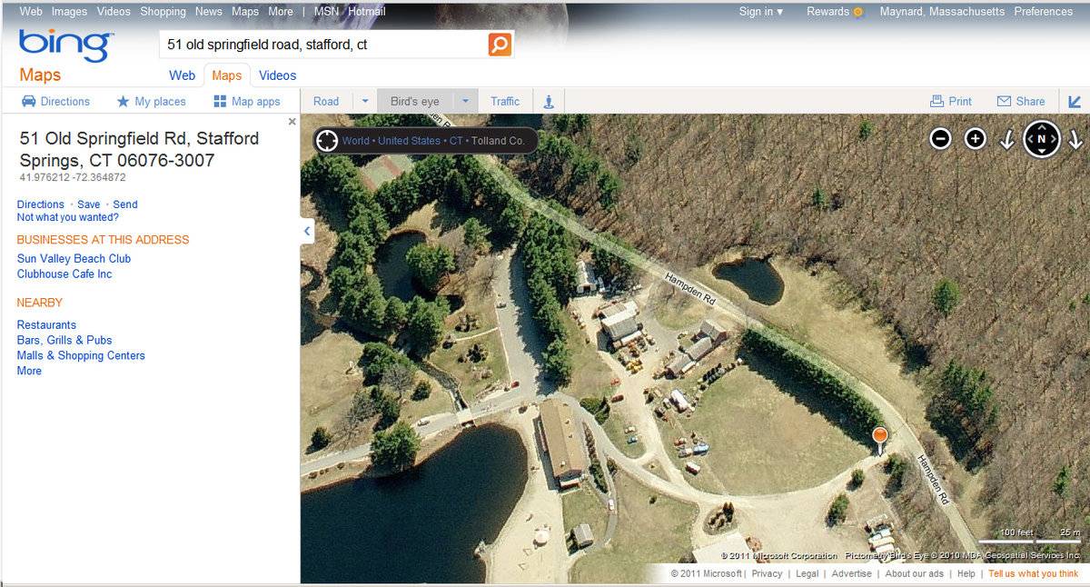 This barn sits on 47.75 acres of land and is to the east of the house with which it is associated. There are two other structures on this property, a gable-roof building to the northeast of the house and a flat-roof building to the northwest of the house. Two tennis courts are found to the southeast of the house. There appears to be a carport to the south of the barn. Also part of the property is Spring Valley Lake and beach, which sits directly to the northeast of the house. The main facade of the house faces west with the ridge-line running parallel with Old Springfield Road. This property is to the northwest of the center of West Stafford and the intersection of Old Springfield Road and Chestnut Mountain Road. To the north of the property are a few open tracts of land and woodland. To the south are woodland, Broadway Pond and some open tracts of land. To the east are Bradway Pond, Orcutts Pond and woodland. To the west is woodland. Surrounding this property are light residential areas, a few open tracts of land, bodies of water and woodland.