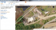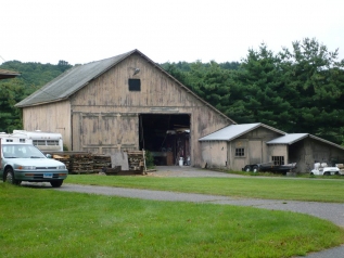 This is a 1 1/2-story gable-entry bank barn with two gable-roof additions. The main facade faces west towards Old Springfield Road, which runs approximately north-south. The ridge-line is perpendicular to Old Springfield Road. The main entry is found centered on the west gable-end of the barn and consists of a bay-wide exterior sliding door, with the opening on the southern side of the facade. Above the opening is a transom window that is now boarded. Midway between the apex of the roof and the dropped girt line siding divide is a hay door opening. Attached to the south corner of the west gable-facade are two connected gable-roof additions with their gables facing towards the street. One appears to be a milk room. The north eave-side of the barn has no apparent openings. The grade drops along the east eave-side of the barn, revealing a basement level. Below grade on the east gable-end of the barn is a pair of windows on the north side with a pass-through door just south of them. To the south of the door is an exterior sliding door with another pass-through door just south of the sliding door. The only other opening on this facade is midway between the apex of the roof and the dropped girt line siding divide, which has a hay door opening similar to the opposite gable. There appears to be a lean-to extending under the saltbox roof on the south eave-facade. All of the siding under grade appears to be board and batten, while the rest of the barn has vertical flush-board siding, painted tan. The roof has a projecting eave overhang with simple brackets, and is clad in asphalt shingles.