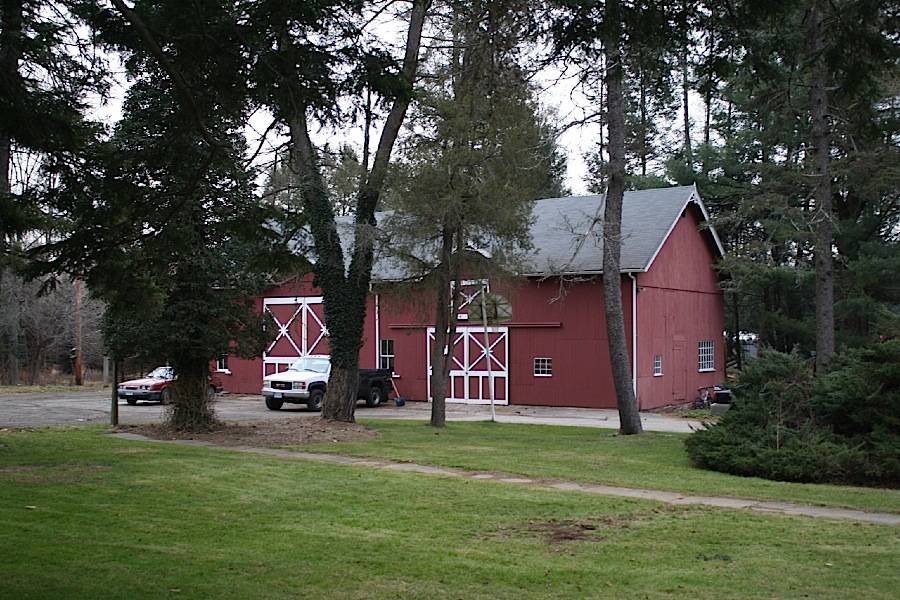 This is a 1 ½-story side- or eave-entry barn with a pair of evenly spaced gabled wall dormers on the main eave-facade, which has five bays. The first bay, in the far left (north) corner, has a two-over-two double-hung window. The main entry is in the second bay and has a pair of full-height exterior sliding doors centered below the first gabled wall dormer. In the third bay is a a two-over-two double-hung window. In the fourth bay, centered below the second gabled wall dormer, is a pair of exterior sliding doors with a sliding haymow door centered above. There is a fixed nine-pane window in the fifth (south) bay. Centered beneath the apex of each gabled wall dormer is an ocular window opening. The south gable-end has a pass-through door centered on the first floor. To the left of the pass-through door is a fixed twelve-pane window and to the right is a fixed twenty-four-pane window. Above the siding divide in the attic-gable is an ocular window opening. The sliding doors and the hay doors have X braces. The barn has vertical siding that is painted red with white trim, a mortared fieldstone foundation, and a shingled roof.
