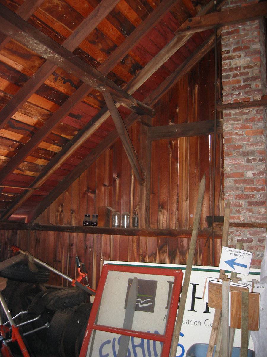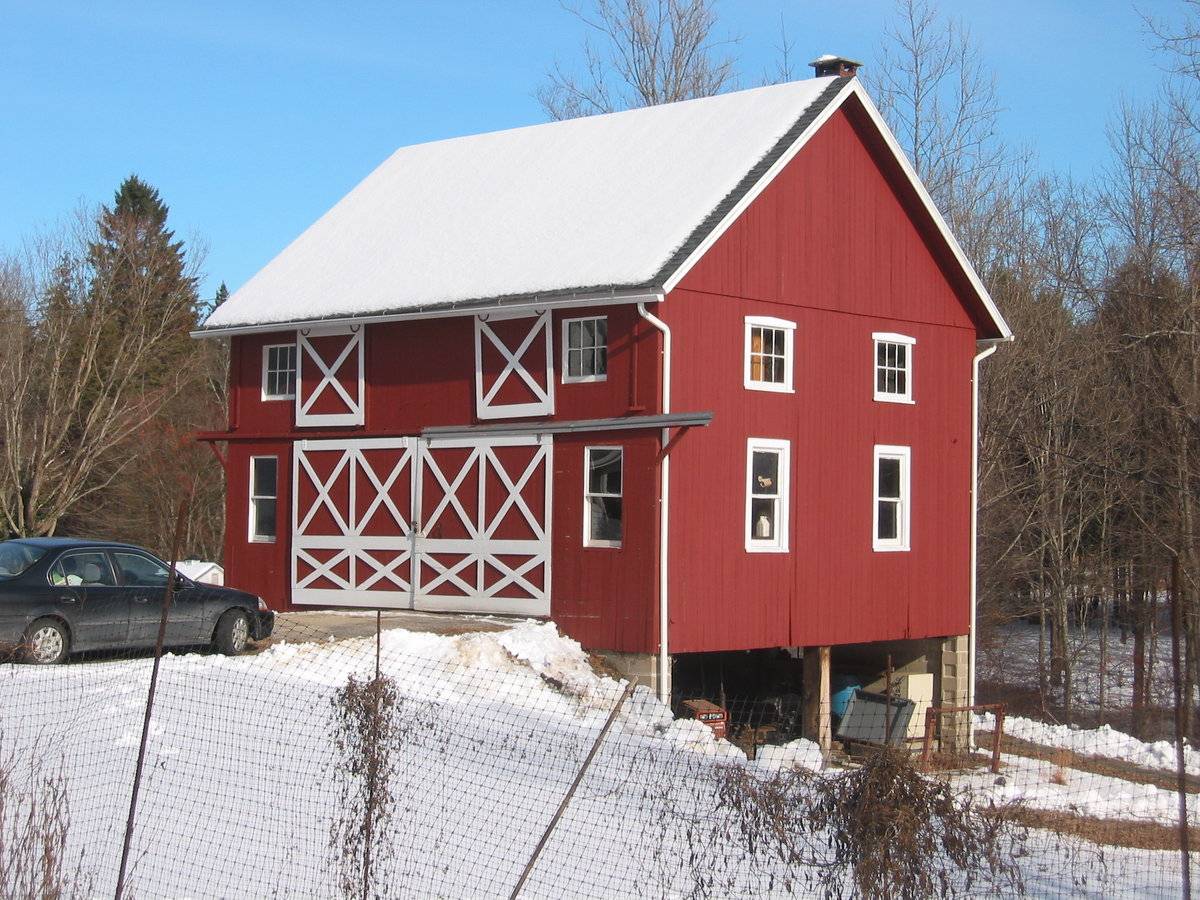 The barn appears to be an example of a field or hay barn. These barns were located in the middle of fields, rather than close to a house, so that hay could be easily be brought to them when harvested. The hay would then be moved to the cow barns once the ground was covered with snow, making transportation easier.