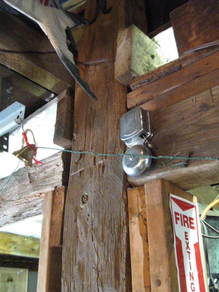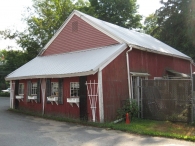 Underneath the antique cola signs and vinyl siding is a 1 and 1/2 story eave or side entry barn, painted red. The barn has vertical siding and appears to have a sliding door hood. The structure has two attached shed-roofed additions, one on either gable end. Both sheds and the barn have metal roofs. The interior structure is comprised of hand-hewn post and beams with pegged mortise and tenon joinery.