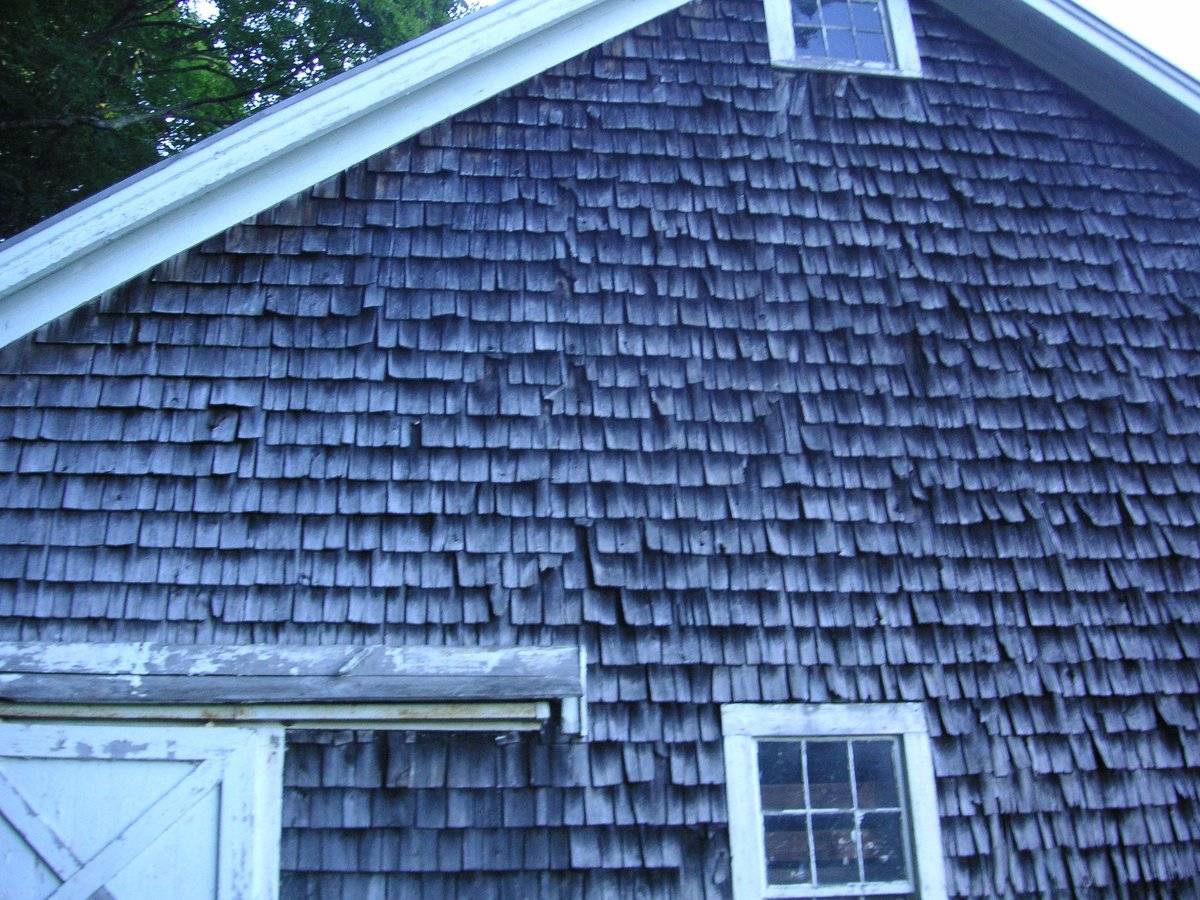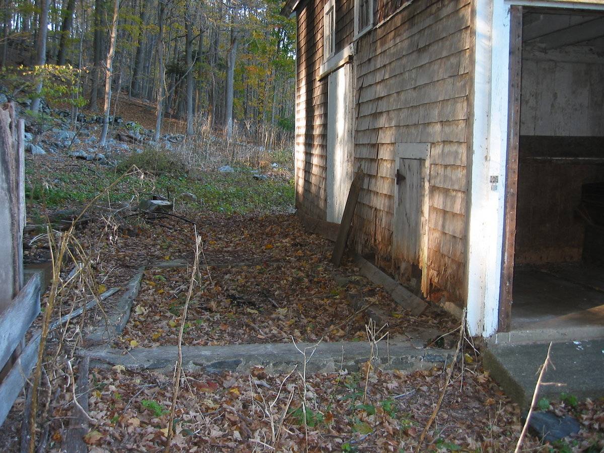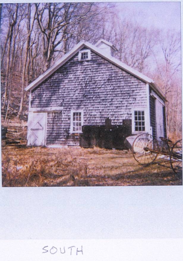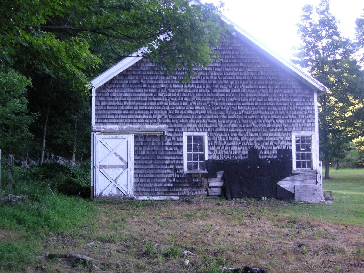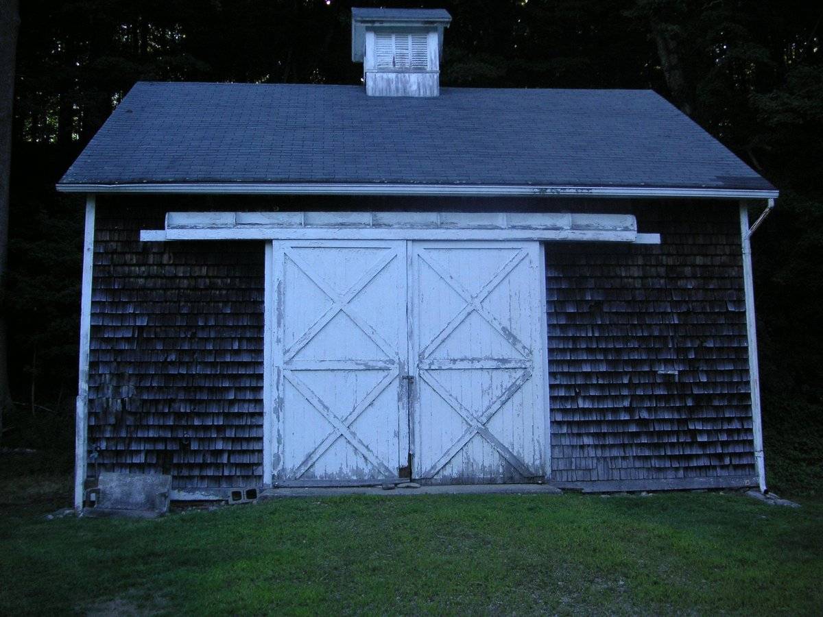 This is a 1 ½ story eave-entry three-bayed barn with its eastern-eave façade facing Black Rock Turnpike. This three-bayed eastern eave-façade is the main façade of the barn and has the main entrance on the middle bay through a pair of hooded cross-braced sliding wagon doors mounted on an exterior-hung metal track with a wooden enclosure. A concrete ramp leads to the main entrance on the middle bay with the grade levels gradually dropping towards the sides, revealing the wooden shirt board and field-stone foundation below. The southern gable-façade of the barn has a second entrance towards the west through a single-leaf exterior-hung hooded braced sliding door mounted on a wooden-enclosed metal door track. The façade also has two six-over-six double-hung sliding windows, one towards the east and the other off-centered towards the west. Exposed horizontal sheathing can be seen below the sill-level of the six-over-six double-hung sliding window towards the east with the damaged areas boarded with ply-wood. The façade has felt-roofing material covering the damaged portions in-between the windows towards the grade level. The southern gable-façade of the barn also has a six-pane window just below the apex of the roof. The three-bayed western eave-façade of the barn has an entrance on the middle-bay through a pair of exterior-hung hooded sliding door, centered below two six-pane windows. The façade has a horizontal marking at the hood-level on the bay towards the south which probably had a shed-roofed addition. A boarded single-leaf hinged pass-through door can be seen punctuating this bay which is a probable connection to the shed-roofed addition that is no longer there. The lower portion of the bay towards the south on the façade has been boarded with ply-wood to cover the damaged areas. The northern gable-façade of the barn is blank apart from a six-pane window insert in the gable attic. The undulating grade level along the northern gable-façade reveals the field-stone foundation below. A louvered cupola can be seen on the center of the roof of the barn. The wooden frame of the barn is supported on field-stone foundation. The barn has asphalt roofing with wood shingles on the walls.