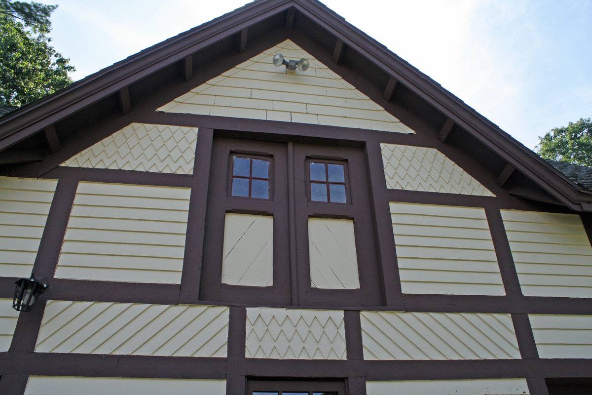 dormer has shingle siding, and below are panels of diamond-pointed shingle siding and of diagonal clapboard