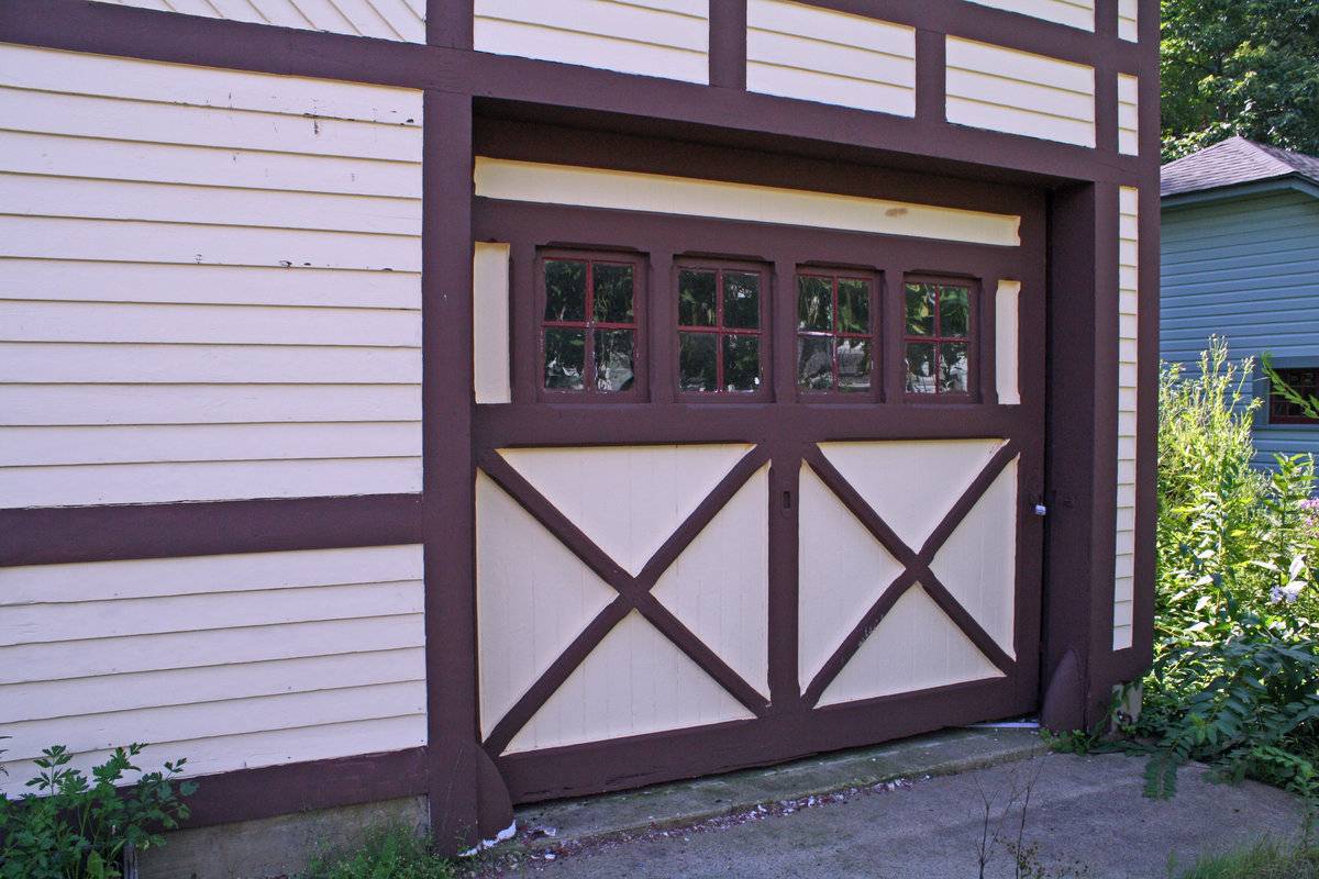 has an interior sliding barn door with four four-pane windows in the upper part above two large panels with xbraces.