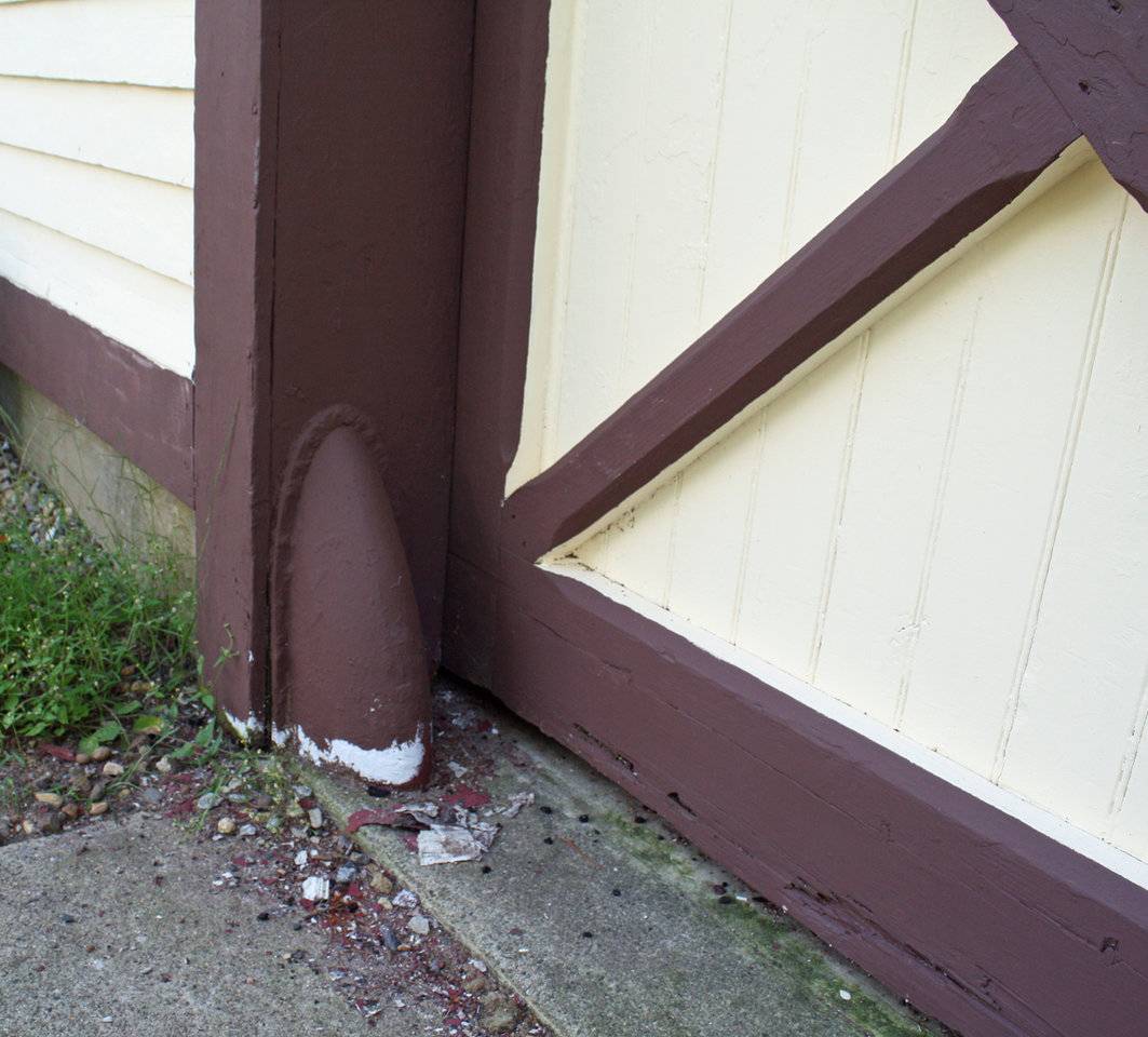 iron bumpers protecting the jambs from vehicle damage. Beneath the apex of the wall dormer is a pair of hay doors