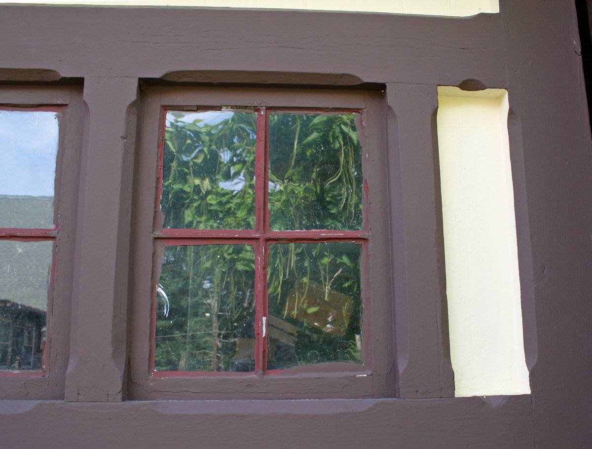 each with a four-pane window above a panel with diagonal tongue-and-groove infill and chamfered frame members.