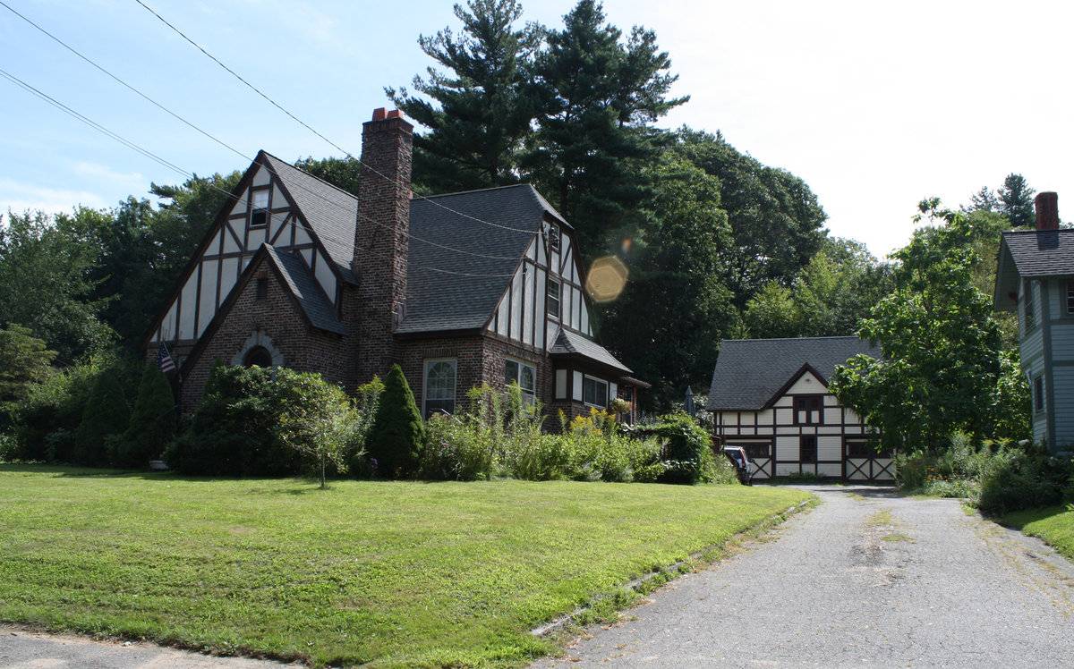 The carriage house is behind and to the south of the c. 1930 house with which it is associated, a replacement structure following destruction of the original by fire. The ridgeline of the carriage house is perpendicular to the ridgeline of the house. The .74 acre site is on the east side of Highland Terrace, a residential street overlooking Stafford Springs, the mills along the Middle River, and Hyde Park, formerly the Julius Converse estate of Woodlawn but home to the town high school from the 1930s through the end of the 20th century. This house is flanked by a row of homes developed from the 1860s to 1900, with the street gradually filling in over time and the architectural styles reflecting the fashions of the late 19th century. This house is a 2 1/2-story gable-roofed structure in an early 20th-century Tudor revival style. The house is set back from the street further than the adjacent homes, all of which date from the mid- to late-20th century.