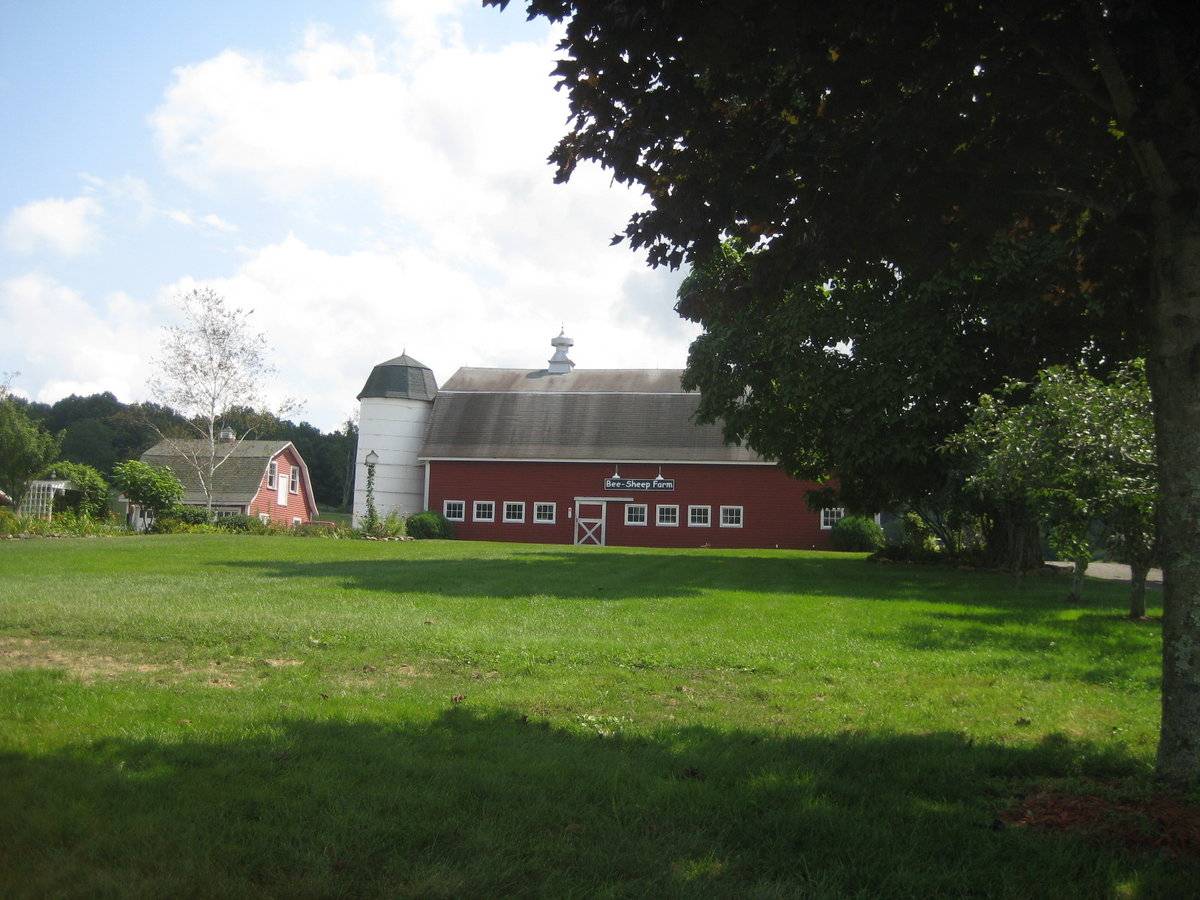This is a 2-story gable-entry gambrel barn with a projecting hay hood. The main facade faces south and the ridge-line is parallel with Moulton Hill Road, which at this point runs approximately north to south. The main entry is found on the south gable-facade of the barn and consists of an exterior sliding door in the middle bay, which slides off to the east. Over the sliding door track is a small hood. There are three fixed four-pane windows with trim in the sliding door. To the west of the sliding door is a single fixed six-pane window with trim. Above the sliding door is a hay door with X bracing. Under the apex of the roof is a pair of irregular shaped hay doors with X bracing on the bottom halves, flanked by fixed nine-pane windows with trim. A fixed six-pane stable window with trim is located near the south corner of the west eave-side of the barn. Towards the north, along the west eave-side of the barn, is a series of eight fixed six-pane stable windows with trim divided by a pass-through sliding door with X bracing; four windows on each side of the door. Centered above this is a painted sign stating: “Bee-Sheep Farm.” Attached to the north gable-end of the barn appears to be a small gable-roof addition and a cypress wood silo. There appear to be no openings on the north gable-end of the barn. Two window openings appear to be on the north side of the gable-roof addition. A shed-roof addition is attached to the south corner of the east eave-side of the barn, extending to the east. The gambrel roof is covered with asphalt shingles and is topped with two metal ventilators. The barn has clapboard siding painted red with white trim.