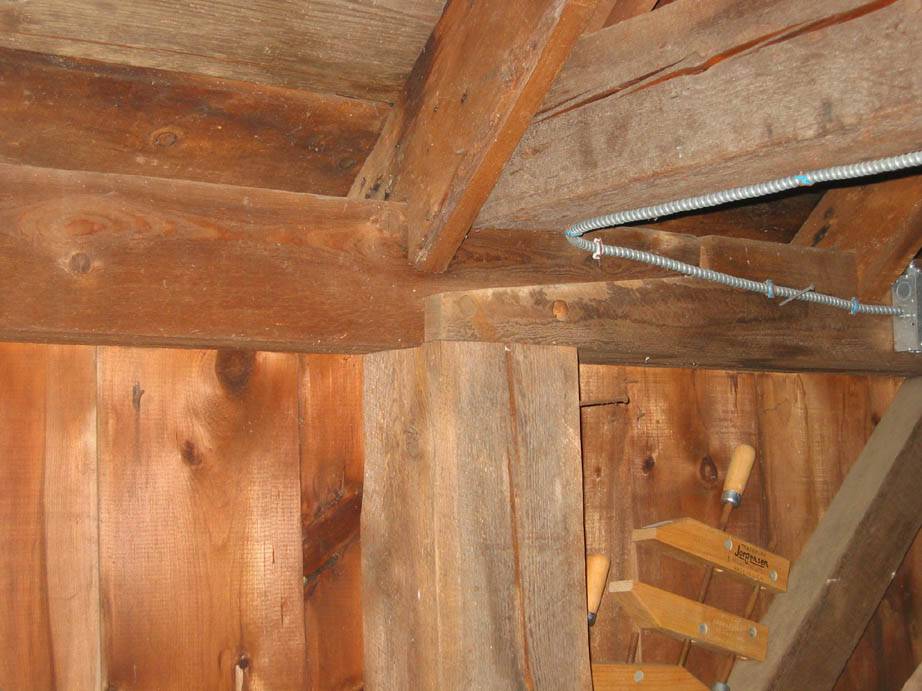 The wood frame of the barn is supported on fieldstone masonry foundation. The post and beam timber frame consists of circular-sawn members with pegged joinery. The barn has asphalt shingles roofing and red painted vertical siding walls with white trim.