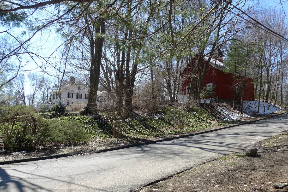 The barn is located along the northern edge of the property, nearer to Woodridge Drive. The ridge line of the barn runs east-west almost perpendicular to this portion of West Road. The south eave-side of the barn opens into a fenced yard. The circa 1766 main residence of the property is located towards the south of the barn while open land can be seen towards its east. The property is accessed by a driveway from West Road towards the east of the main residence that continues northwards approaching the barn. A second through-driveway from Woodridge Drive around a landscaped area can be seen towards the west of the barn. The property has open land surrounding the main residence while stone masonry boundary wall lined by trees can be seen along the edges.