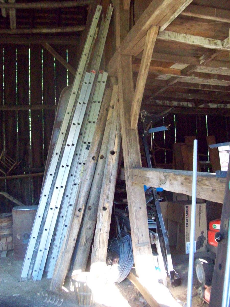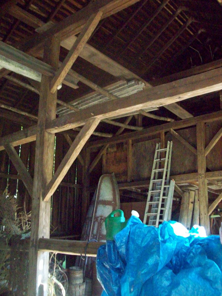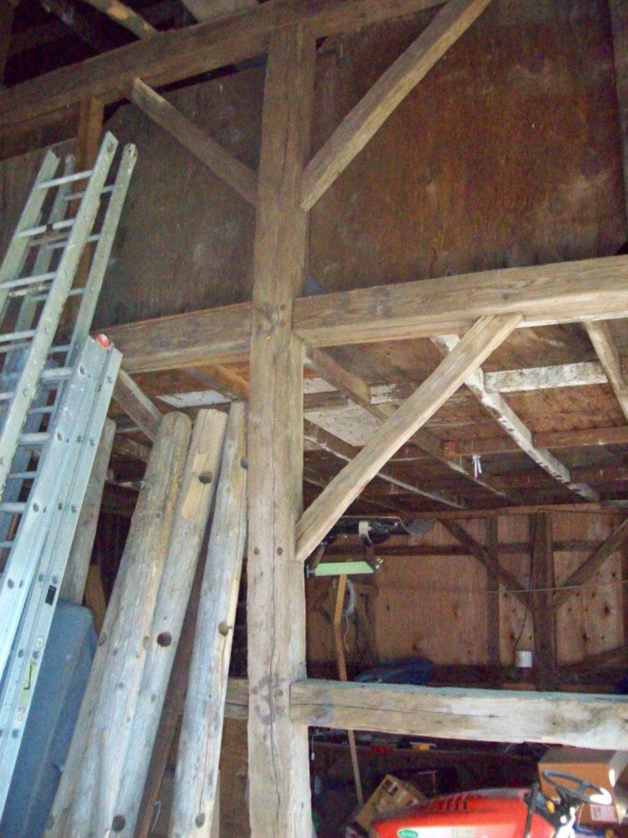 Listed on the State Register of Historic Places 10/02/2013. Three pairs of hinged doors have been cut into the long side; traces of single board width hinged vent panels from tobacco curing are visible above the wide doorways and on the opposite side. Notes from Owner: The photos show the outside, and the inside framing. It served as a tobacco barn from probably the 1930’s to the 1950’s. I don’t believe it was originally built for that purpose, as it has 4 bays, and no provisions for doors at the ends. Oral history says that the original barn on the site burned about 1930, and this barn was purchased, disassembled, moved from Portland, and reassembled in South Glastonbury. The framing timbers are numbered, which would seem to support the story. Also, note the severe bowing of some of the timbers. We had it re-roofed last year to stop the water damage from continuing. It had been leaking for many years before we moved in recently.