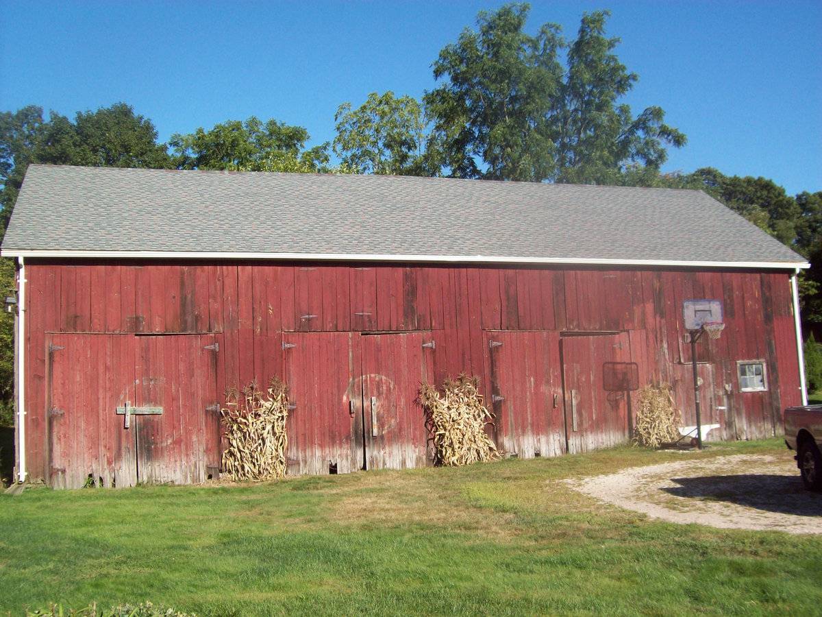 The wooden frame of the barn has asphalt shingle roofing and red-painted vertical siding with white corner boards.
