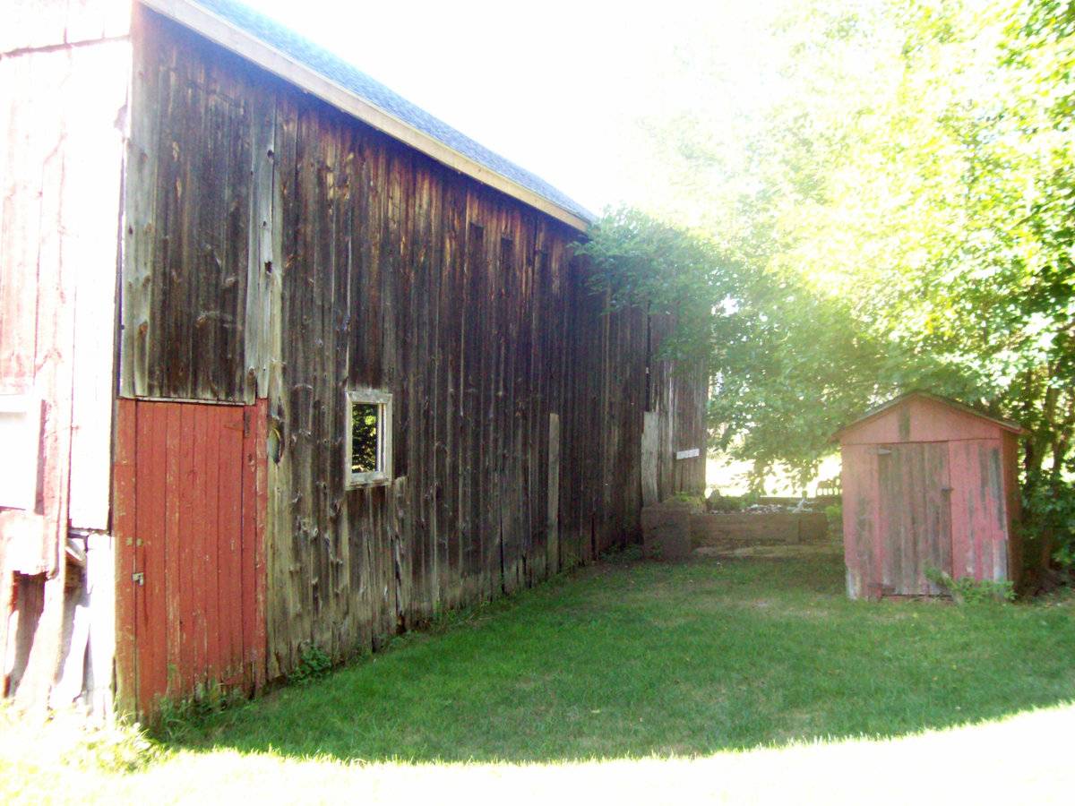 This is a 1 ½-story eave-entry tobacco shed towards the east of Main Street. The ridge line of the shed runs north-south parallel to the road. The main façade of the tobacco shed is the four-bay west eave-façade with three main entrances, one each in the first, second and the third bays from the north. Each main entrance to the shed is through a pair of hinged wagon doors. The first bay from the south on the main eave-façade has a secondary entrance towards the north through a hinged pass-through door and a six-pane stable window towards the south. The east four-bay eave-side of the tobacco shed has an entrance towards the southern edge through a hinged wagon door and a window towards its north. The tobacco shed has a system of ventilation through the vertical siding on the eave sides in which alternate boards are hinged along the sides to open like tall narrow doors, each held in place by its own hook.