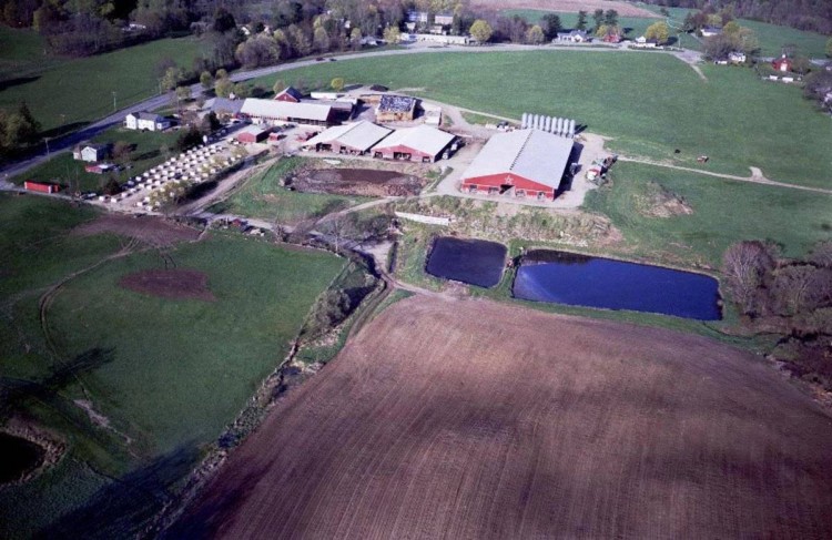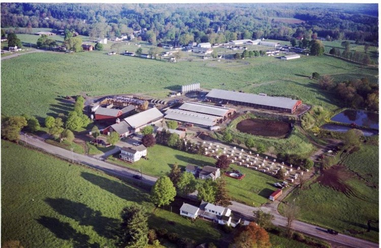 A member of the Farmers Cow organization which markets Connecticut grown milk and eggs. Multiple structures including New England barn, pole barn cow sheds. Fairvue Farms is located next to the historic Woodstock Fairgrounds in Woodstock, CT. In the past 40 years the Millers have expanded their herd from 40 cows to a herd of 600 Holstein milking cows. In the “milking parlor” 40 cows at a time can be milked in separate stalls, and it has a visitor observation area where school groups, for example, can watch the process. Baby calves are raised in individual “hutches” and are hand fed. The Millers have expanded their cropland acreage in recent years and farm more than 1600 acres, most of which is leased form other property owners in the area. Their family believes they need to be good stewards of the land, observing careful practices in conservation and wildlife management on the farm. Fairvue Farm hosts guided tours through their farm as part of “Celebrating Agriculture” held at the Woodstock Fairgrounds each September. Diane and Paul Miller: Diane and Paul have been dairy farming together since 1967 when they purchased Fairvue Farm in Woodstock from Paul’s mother. The Millers are strong believers in a positive future for dairy farming and locally grown products which is why they are active in Woodstock’s local Grange and agricultural committees. The four generations of Miller families work to keep the community informed of what’s happening on the farm by speaking to town officials, at local church and civic gatherings, and through the local media. Source: http://www.thefarmerscow.com/ctfamily_farms.html Aerial photos by G. Leslie Sweetnam for The Farmers Cow.