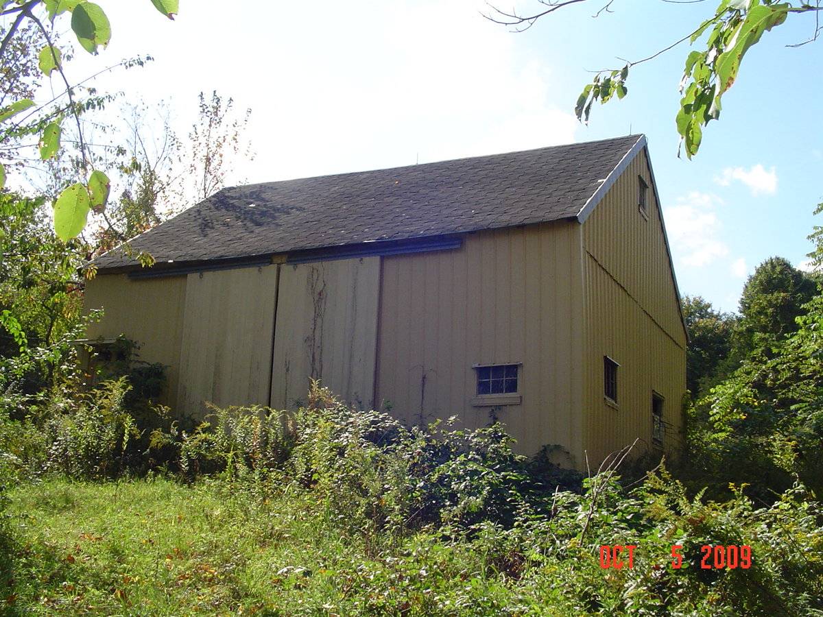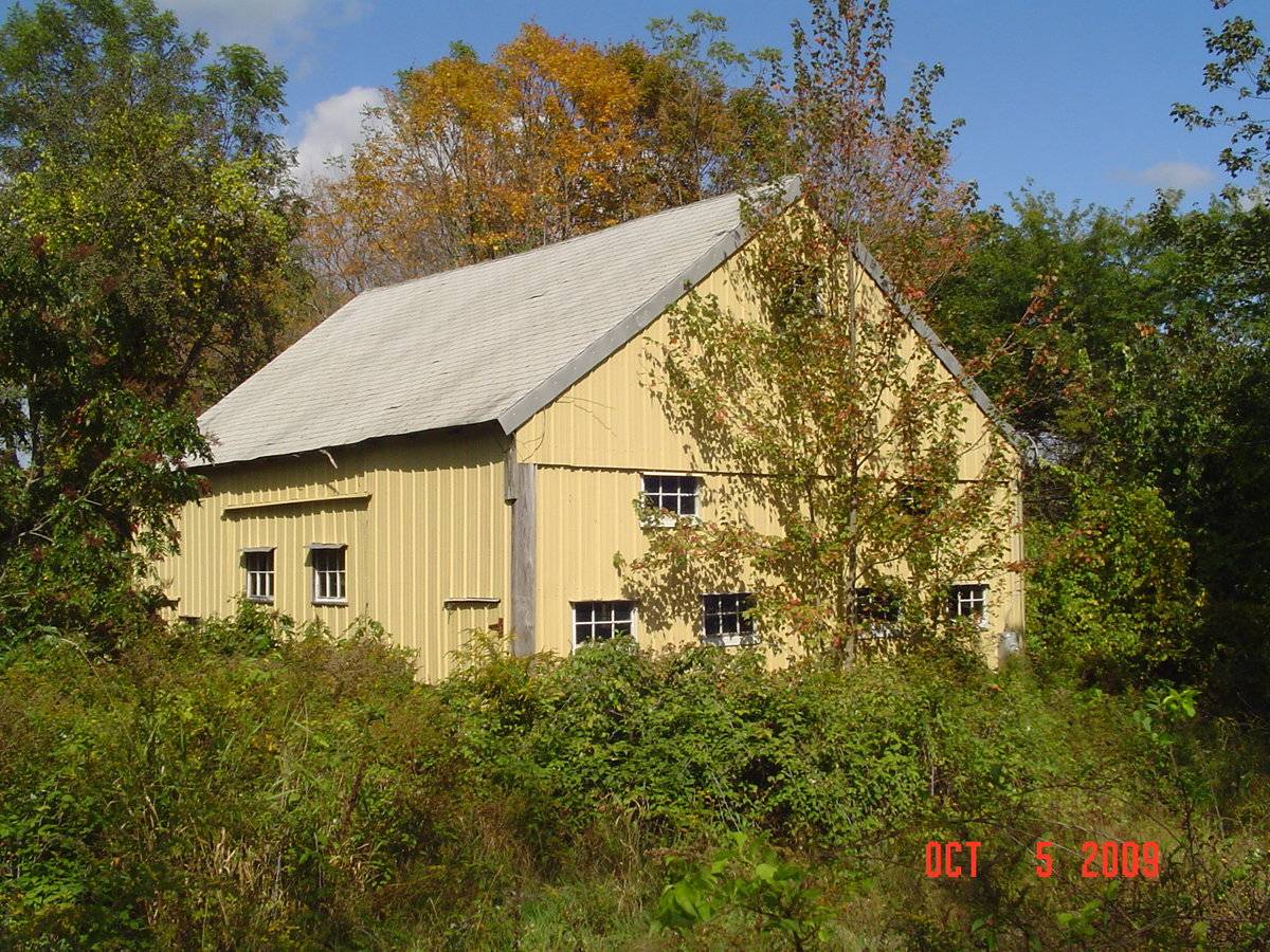 Owner states that this yellow metal-sided barn which was moved from its original location across the street approximately 100 years ago (1909) once housed his uncle's "Sunday horses". Post and beam inside. Original wood siding can be found under yellow metal siding. Windows appear to be original. Grant pre-application 2008.