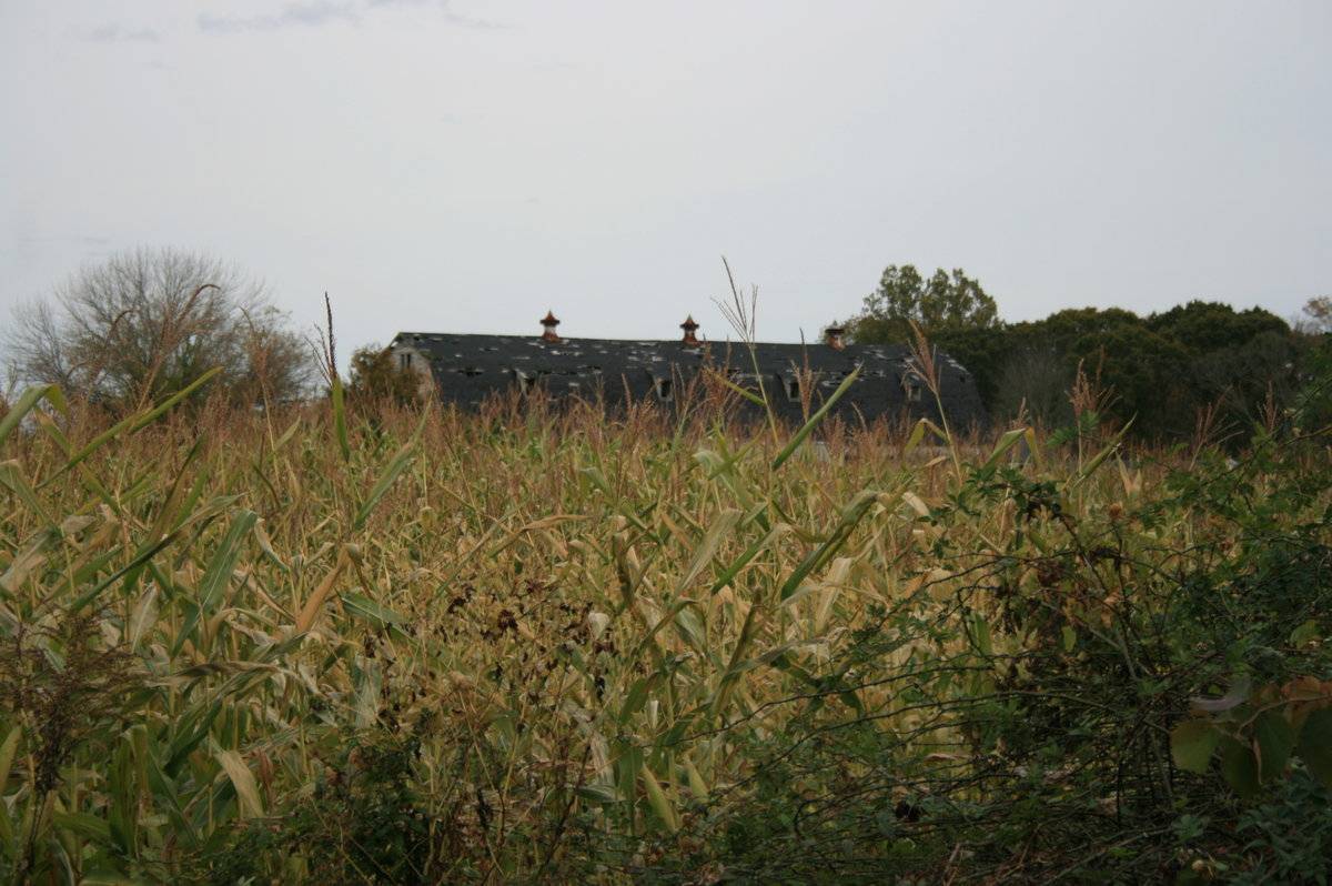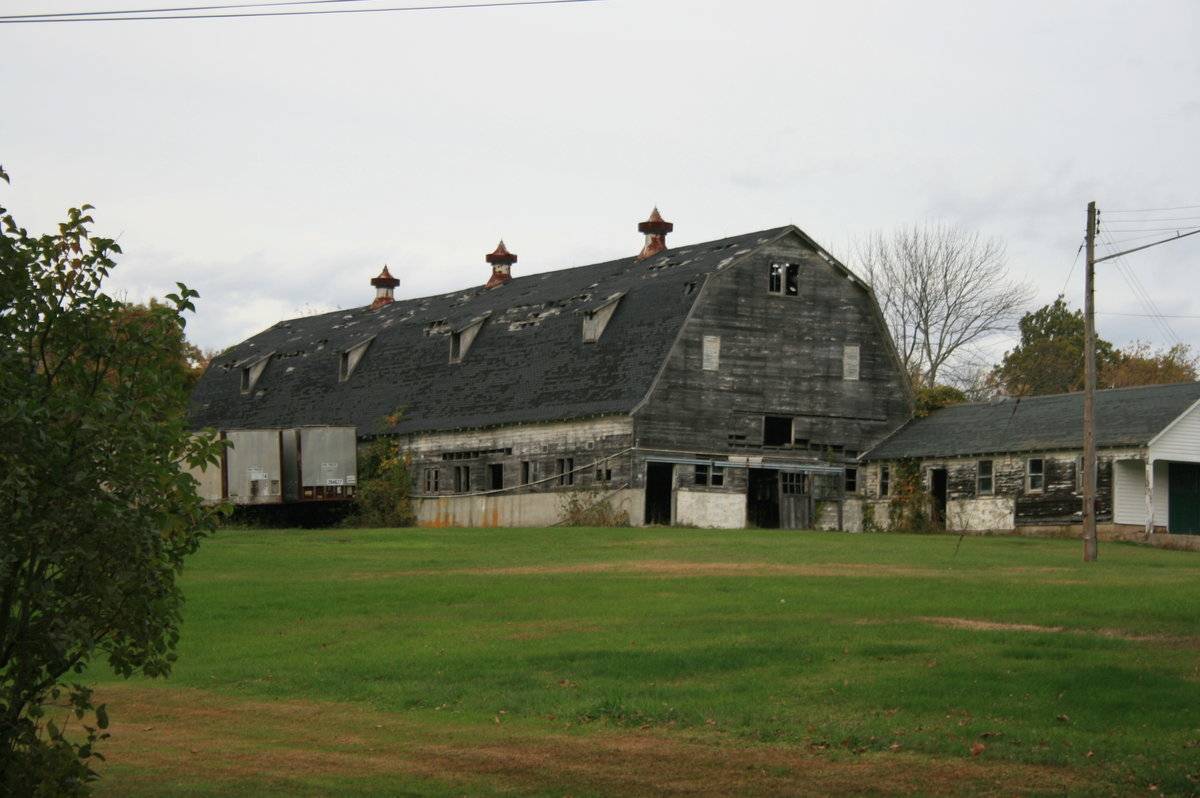 The barn sits behind a long wagon shed/garage, a couple of small outbuildings, and the farmhouse, which faces the road.