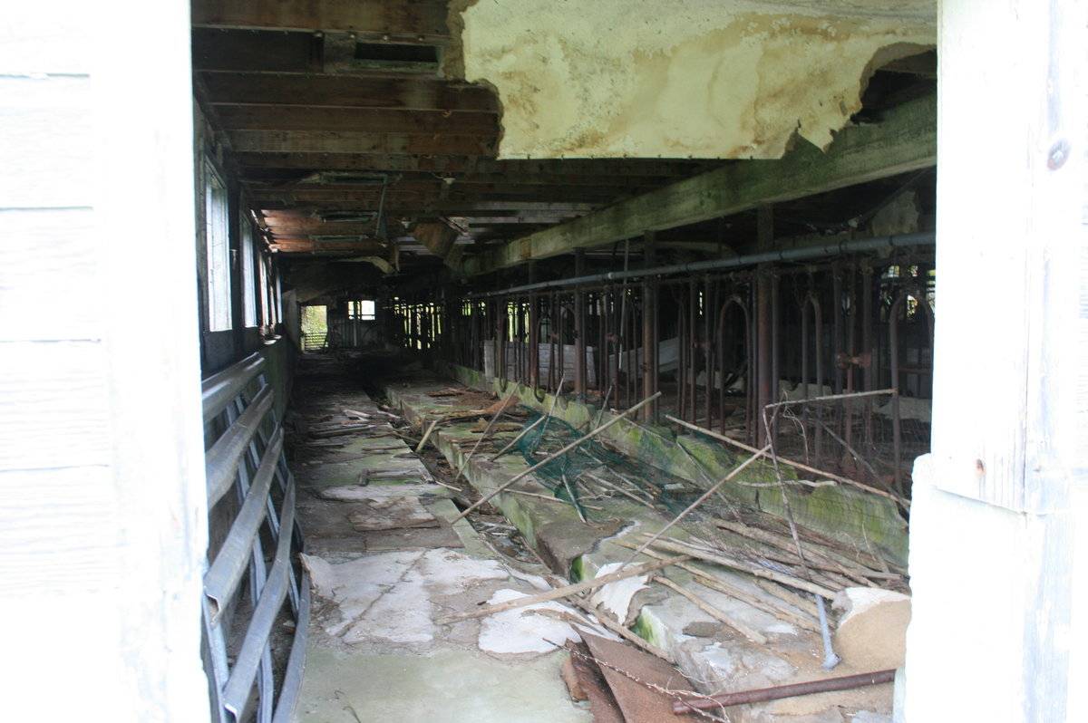 This is a 2 1/2 story gable-entry gambrel stable barn with a gable-roofed addition. The main facade faces south towards Sunrise Dairy Farm, which runs approximately east-west. The barn is severely deteriorated. The main entry is a pair of exterior sliding doors, each with eight fixed panes. The west corner has a pass-through exterior sliding door, now gone. The second story has a pair of vents. Below the apex of the roof is a pair of window spaces. Form the main grade to about the four foot mark on this facade and all around the barn is concrete block masonry for the foundation. Extending south off this facade is the gable-roofed addition. The west eave-facade has a series of stable windows and four dormers as does the east eave-facade. The failing roof is asphalt shingles topped with three metal ventilators. The interior of the barn has a large number of stanchions, indicating that the barn was used for dairy.