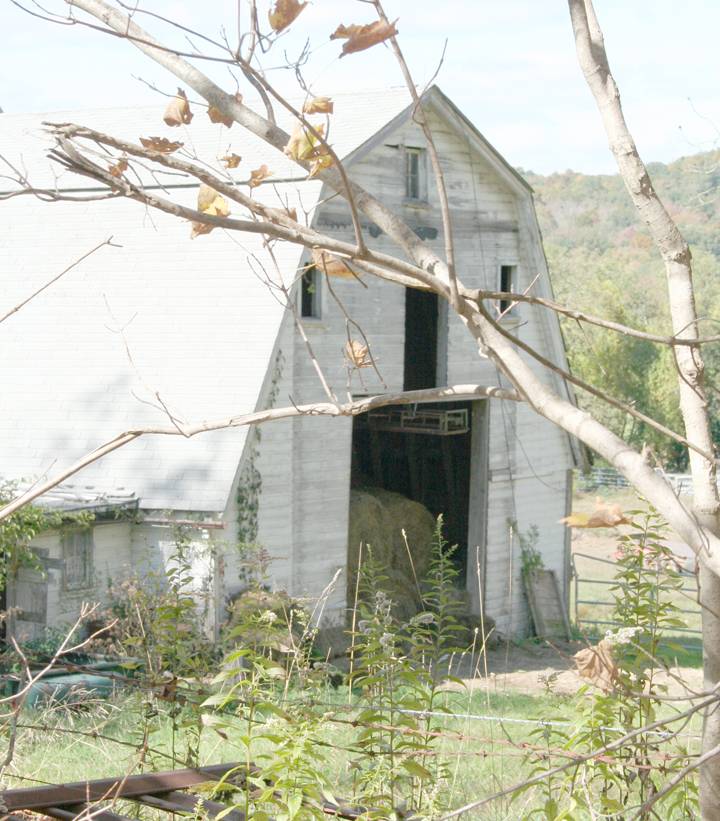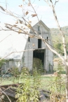 The largest of many structures on this working farm is a gambrel barn located north of the road and with its ridge line oriented east-west parallel to the road. The east gable-end has a large barn door opening with an overhead loading track visible inside. Above are a pair of small openings flanking a haymow door, and in the peak is a four-light window. The west façade has a row of stable windows at grade level, and a large haymow door above with a pair of hinged doors. A steel hoist projects from the wall under the peak. Siding is horizontal ship-lap boards.