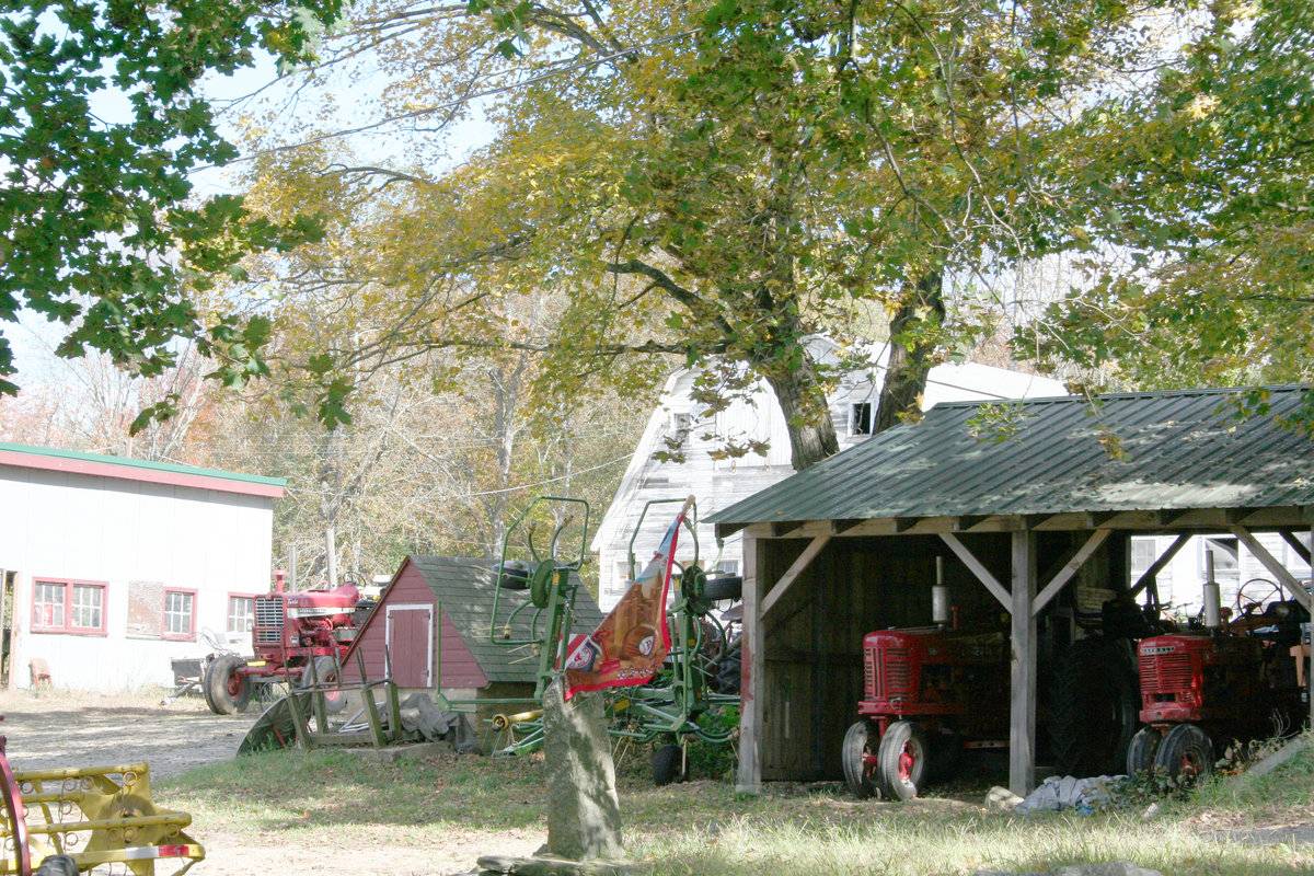 Additional buildings include a chicken coop with flat or shed roof and a row of windows in the south façade, an open wagon shed for tractors, and several other sheds and barns.