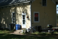 The gambrel roof is asphalt shingles, with a metal ventilator at the center of the peak.