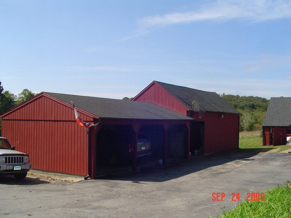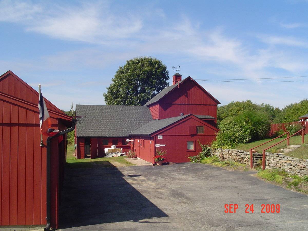 George and Marybelle Garypie owned this dairy farm in the 1940-1950s. House is 1893. Present owner thinks the original parts of this dairy barn may be older than the house. The milking parlor portion of the barn was rebuilt in 1986 and is now the business office of AA Lock & Key. The cupola is fake and purely decorative, states the present owner, as is the red paint on the barn and secondary building. They enhanced the barn with red exterior paint and cupola in 1978. Barn was whitewashed when they bought the property. Secondary building closer to the road housed farm equipment and was also a roadside vegetable farmstand at one time.